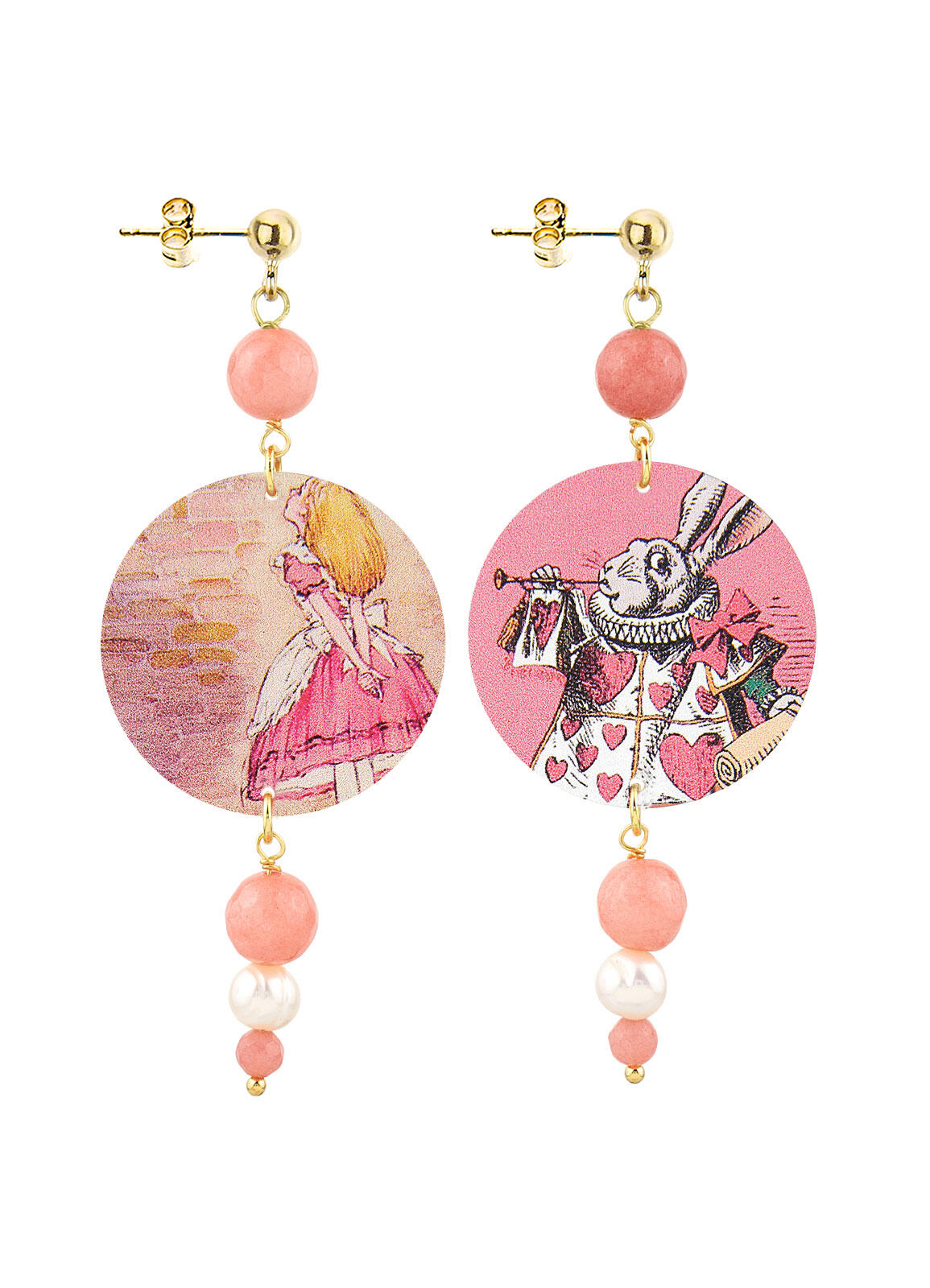 Orecchini composti da una capsula piatta stampata. Elementi in ottone galvanizzato oro e pietre naturali. Lunghezza 8,5 cm. Diametro 3 cm. Chiusura piattino e farfallina. Made in Italy