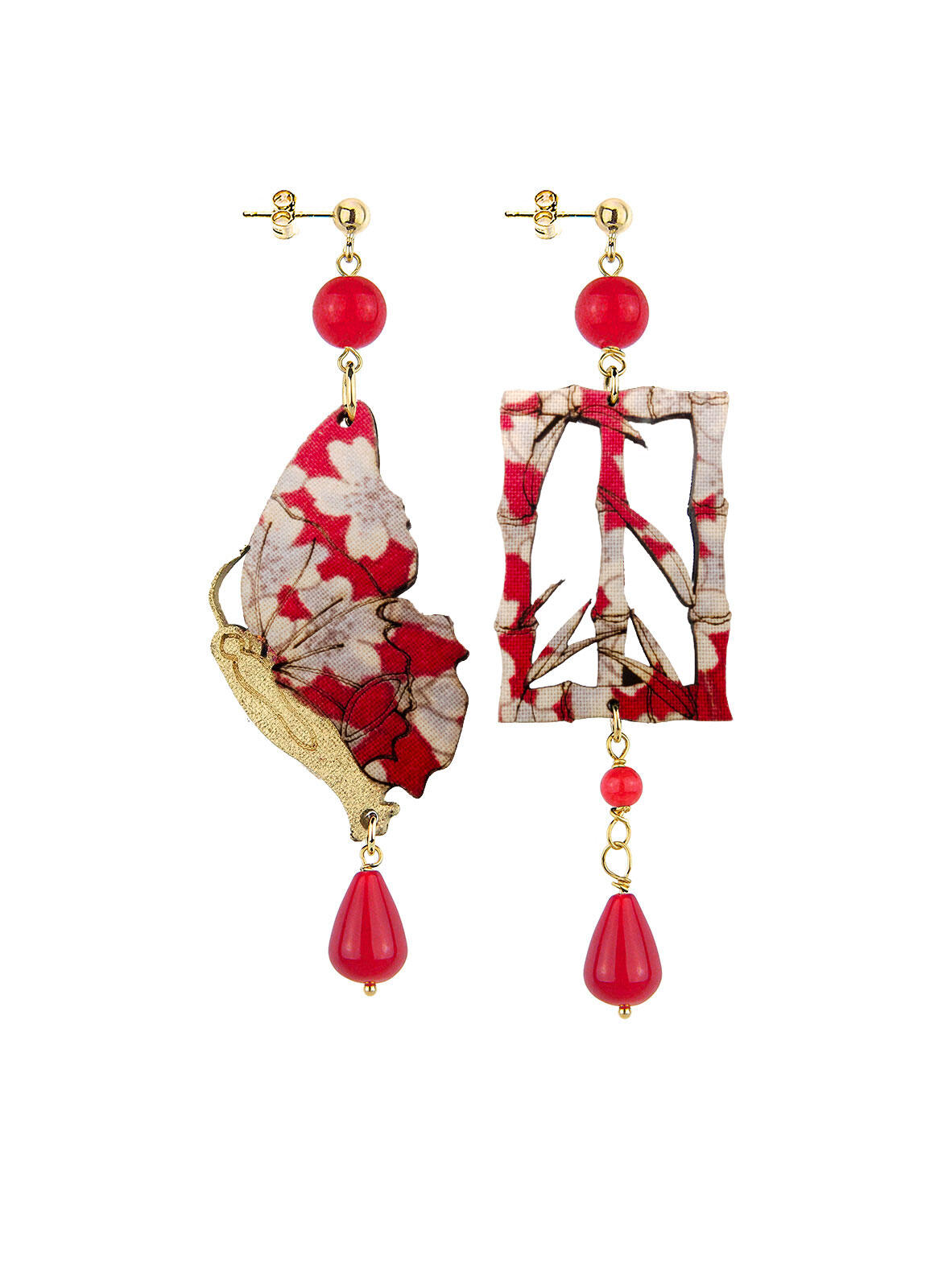 Butterfly earrings in Japanese fabric, gold galvanized brass elements and colored stones. Length 8 cm, width 2.5 cm. Closing with pin. Made in Italy