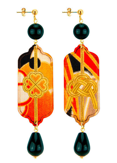 I quattro musubi danno vita a due coppie di orecchini: Hanamusubi con Katabami, Musubikiri con il nodo dell’Infinito. I materiali restano fedeli alla tradizione Lebole: seta da antichi kimono giapponesi, tessuti a righe o pois, ottone galvanizzato oro e pietre naturali.