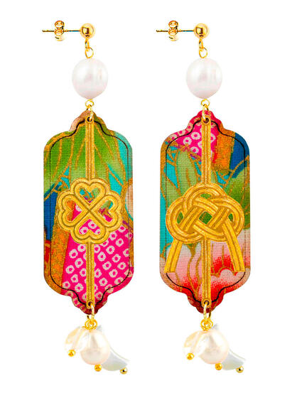 I quattro musubi danno vita a due coppie di orecchini: Hanamusubi con Katabami, Musubikiri con il nodo dell’Infinito. I materiali restano fedeli alla tradizione Lebole: seta da antichi kimono giapponesi, tessuti a righe o pois, ottone galvanizzato oro e pietre naturali.