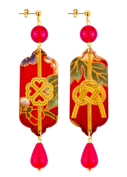 I quattro musubi danno vita a due coppie di orecchini: Hanamusubi con Katabami, Musubikiri con il nodo dell’Infinito. I materiali restano fedeli alla tradizione Lebole: seta da antichi kimono giapponesi, tessuti a righe o pois, ottone galvanizzato oro e pietre naturali.