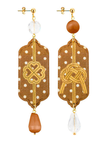 Orecchini in seta, ottone galvanizzato oro e pietre naturali. Lunghezza 9 cm. Made in Italy