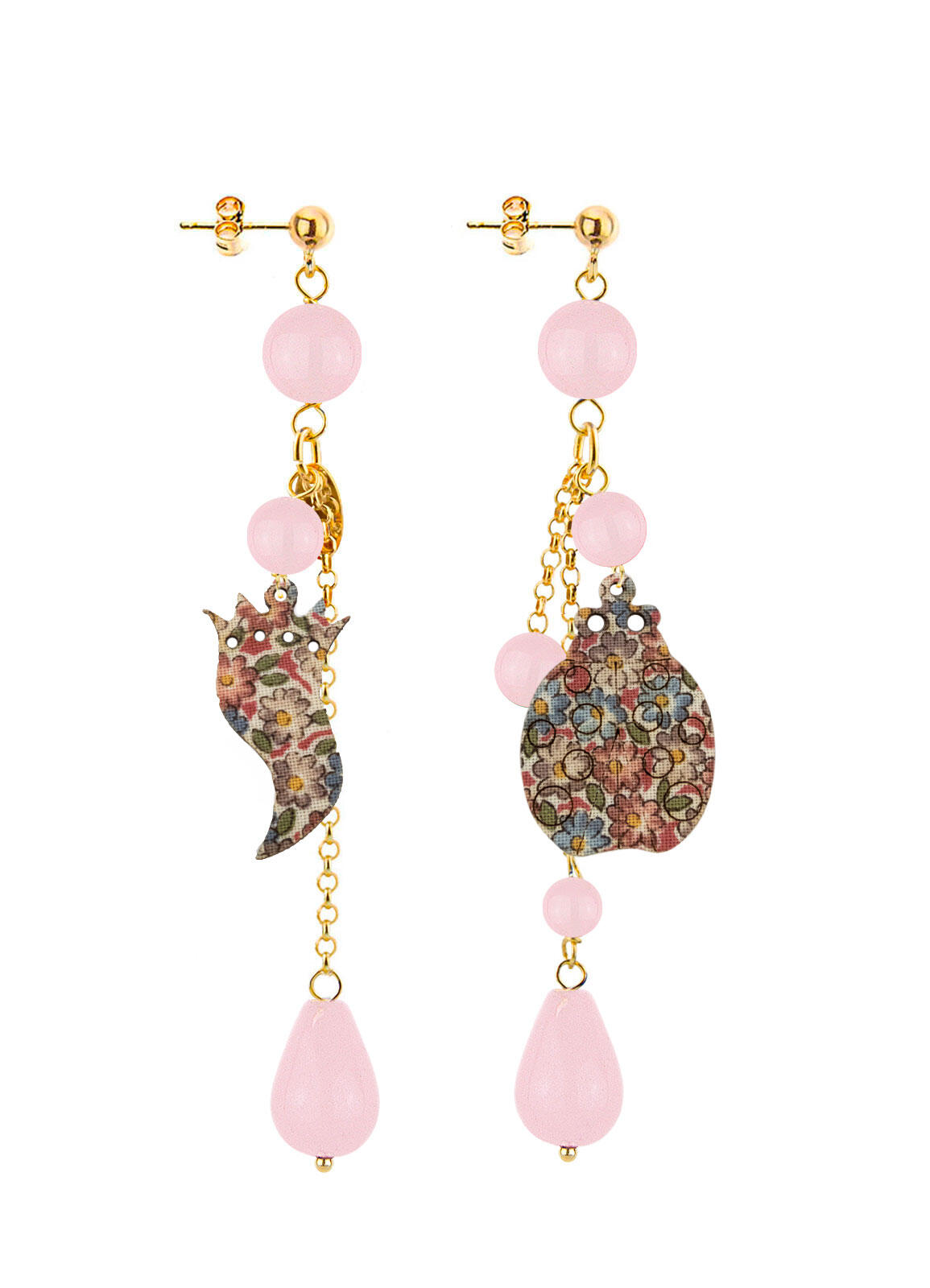 Gold-plated brass earrings, antique kimono fabrics, and natural stones. Length: 9 cm. Pin and butterfly closure. Made in Italy.
