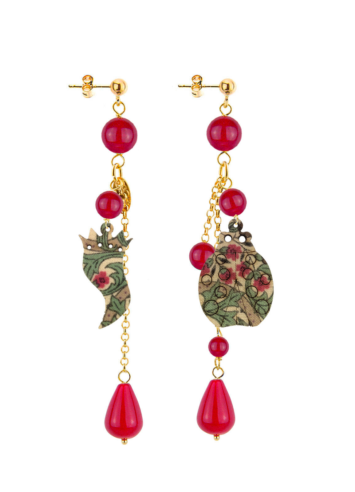 Gold-plated brass earrings, antique kimono fabrics, and natural stones. Length: 9 cm. Pin and butterfly closure. Made in Italy.