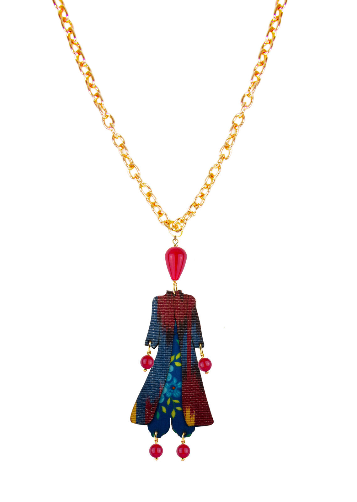 Necklace made of ikat fabrics from Uzbekistan stretched with a special process on a very light wooden core. The stones are natural stones mounted with galvanized brass elements. Chain length 70 cm, pendant 7 cm. Made in Italy
