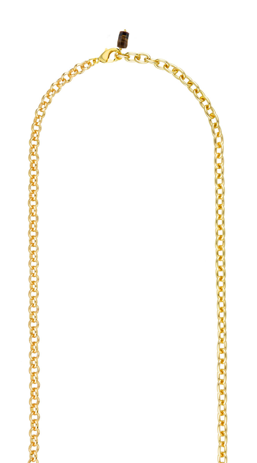 Collana in alluminio galvanizzato oro, elementi e pietre naturali. Lunghezza collana 94 cm. Lunghezza ciondolo 12,5 cm. Chiusura con moschettone. Made in Italy