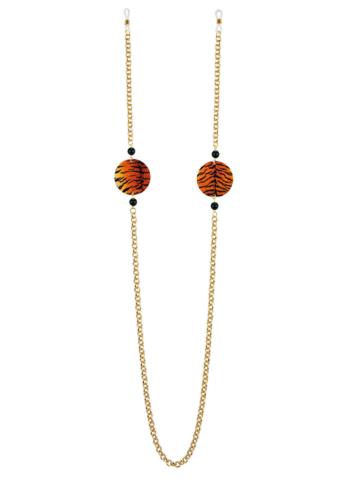 Accessorio porta occhiali con catena in ottone bagnato oro ed elementi della collezione The Circle. Lunghezza catena 85 cm. Lunghezza elemento 3 cm. Taglia Unica. Made in Italy