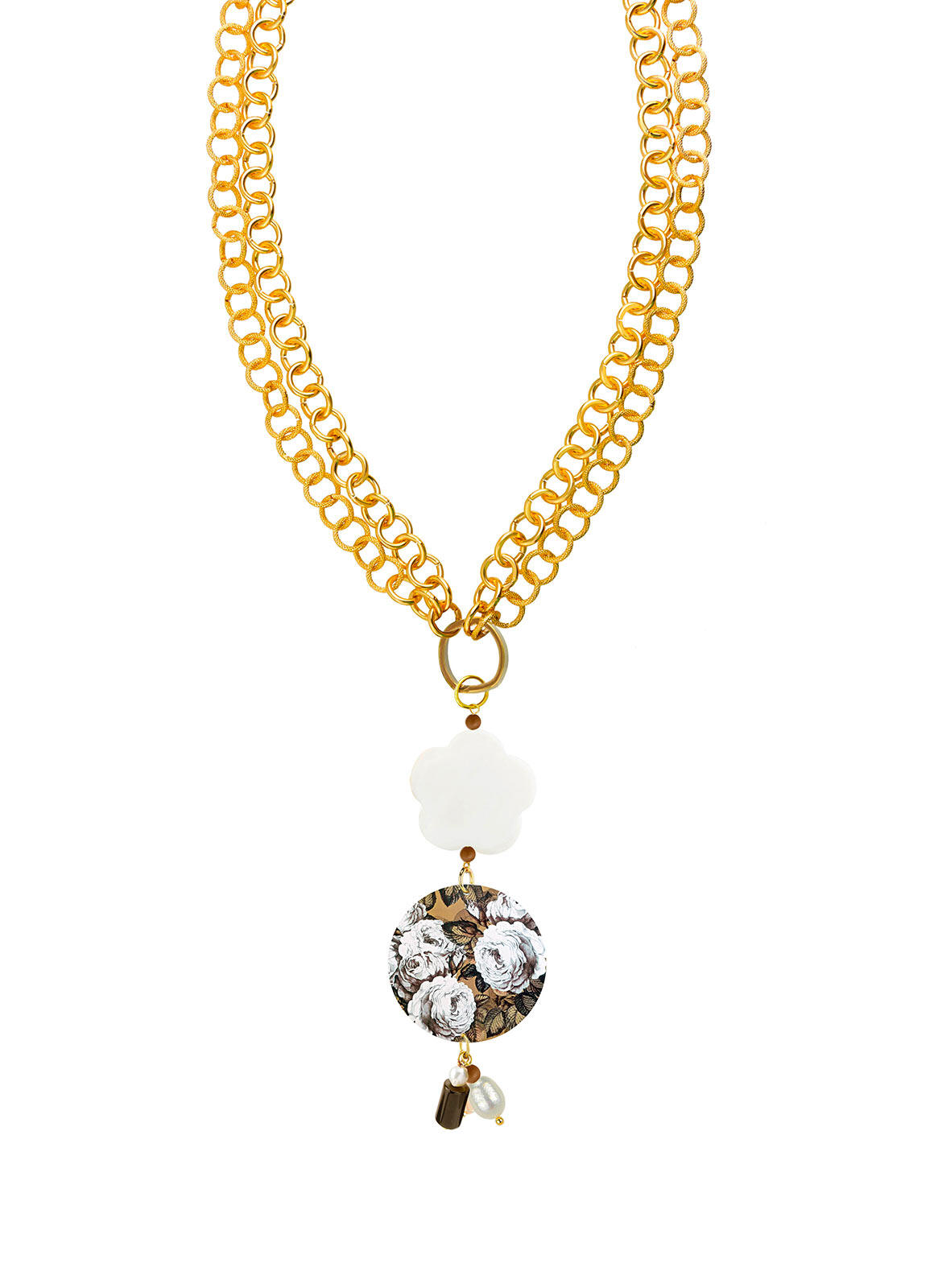 Collana in alluminio, capsula piatta stampata, elementi in ottone galvanizzato oro e pietre naturali. Lunghezza collana alluminio regolabile 45/90 cm. Lunghezza ciondolo 9,5 cm. Made in Italy