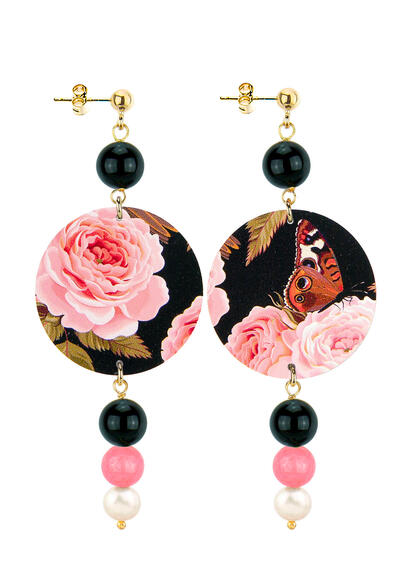 Orecchini composti da una capsula piatta stampata. Elementi in ottone galvanizzato oro e pietre naturali. Lunghezza 8,5 cm. Diametro 3,5 cm. Chiusura piattino e farfallina. Made in Italy