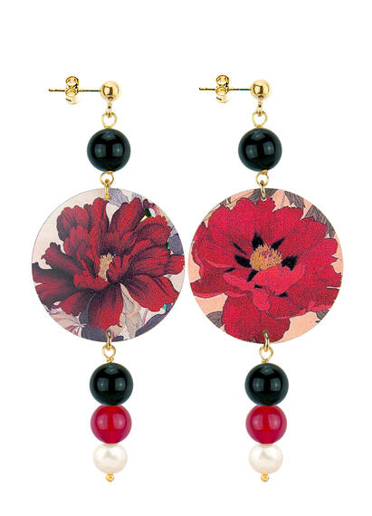 Orecchini composti da una capsula piatta stampata. Elementi in ottone galvanizzato oro e pietre naturali. Lunghezza 8,5 cm. Diametro 3,5 cm. Chiusura piattino e farfallina. Made in Italy