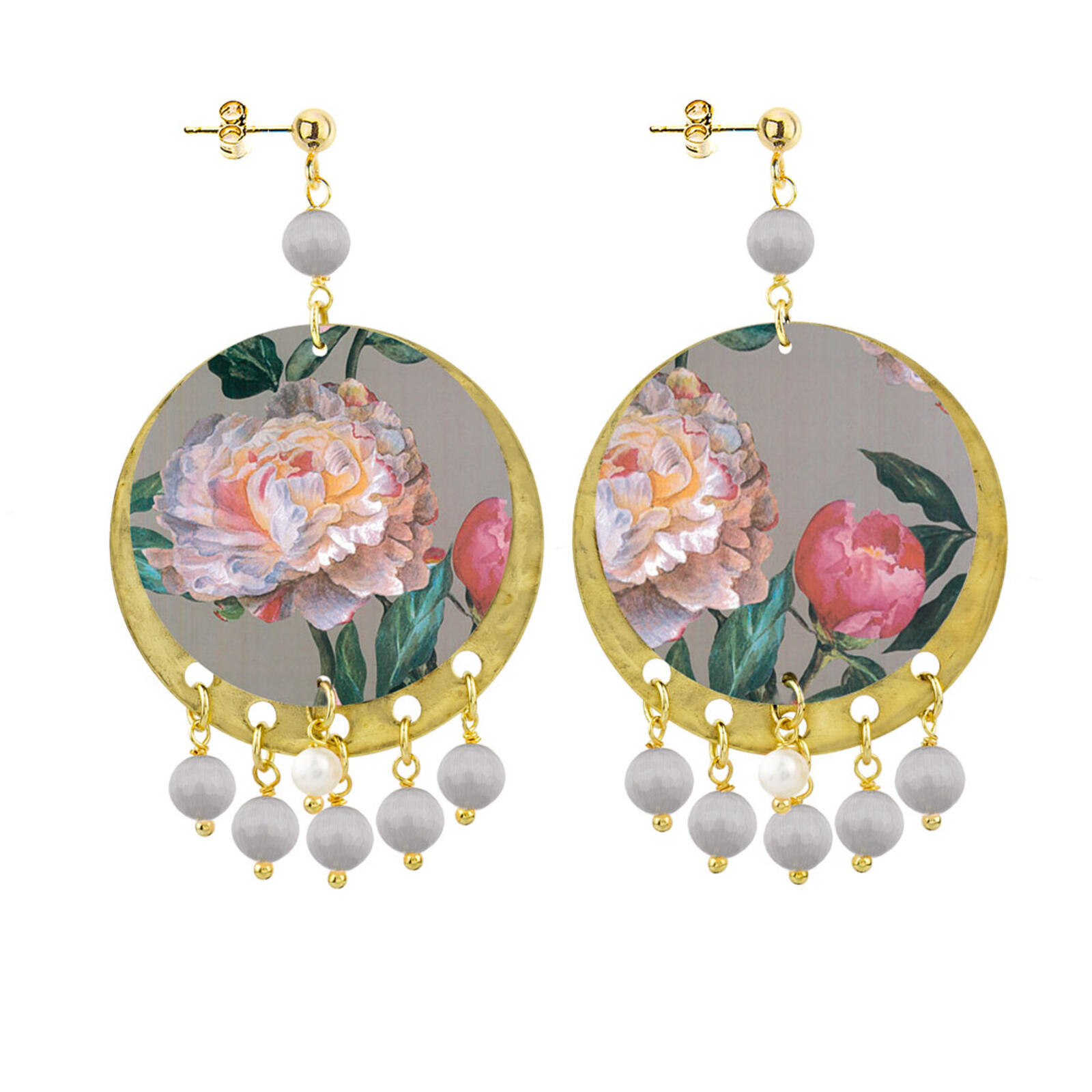 Orecchini composti da una capsula piatta stampata. Elementi in ottone galvanizzato oro e pietre naturali. Lunghezza 8,5 cm. Diametro 3.5 cm. Made in Italy