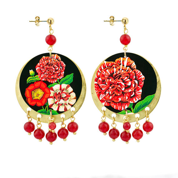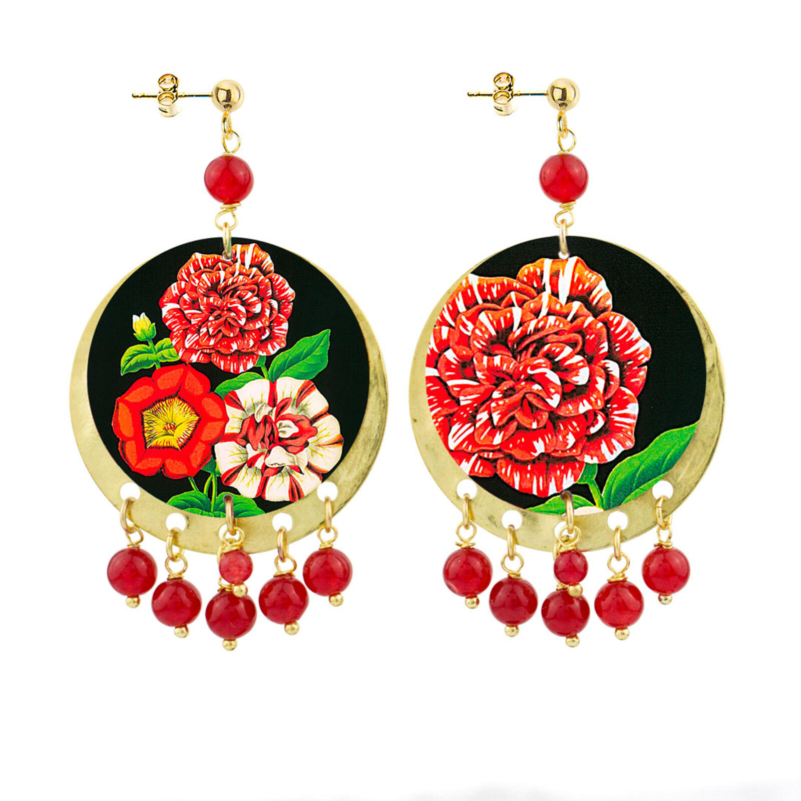 Orecchini composti da una capsula piatta stampata. Elementi in ottone galvanizzato oro e pietre naturali. Lunghezza 8,5 cm. Diametro 3.5 cm. Made in Italy