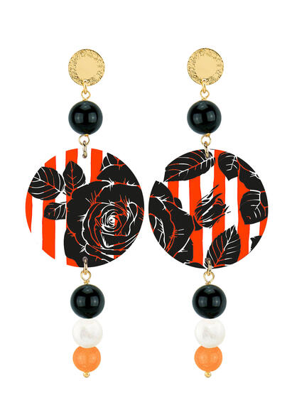 Orecchini composti da una capsula piatta stampata. Elementi in ottone galvanizzato oro e pietre naturali. Lunghezza 9 cm. Diametro 3,5 cm. Chiusura piattino e farfallina. Made in Italy