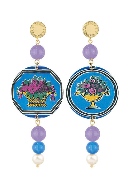 Orecchini composti da una capsula piatta stampata. Elementi in ottone galvanizzato oro e pietre naturali. Lunghezza 9 cm. Diametro 3,5 cm. Chiusura piattino e farfallina. Made in Italy