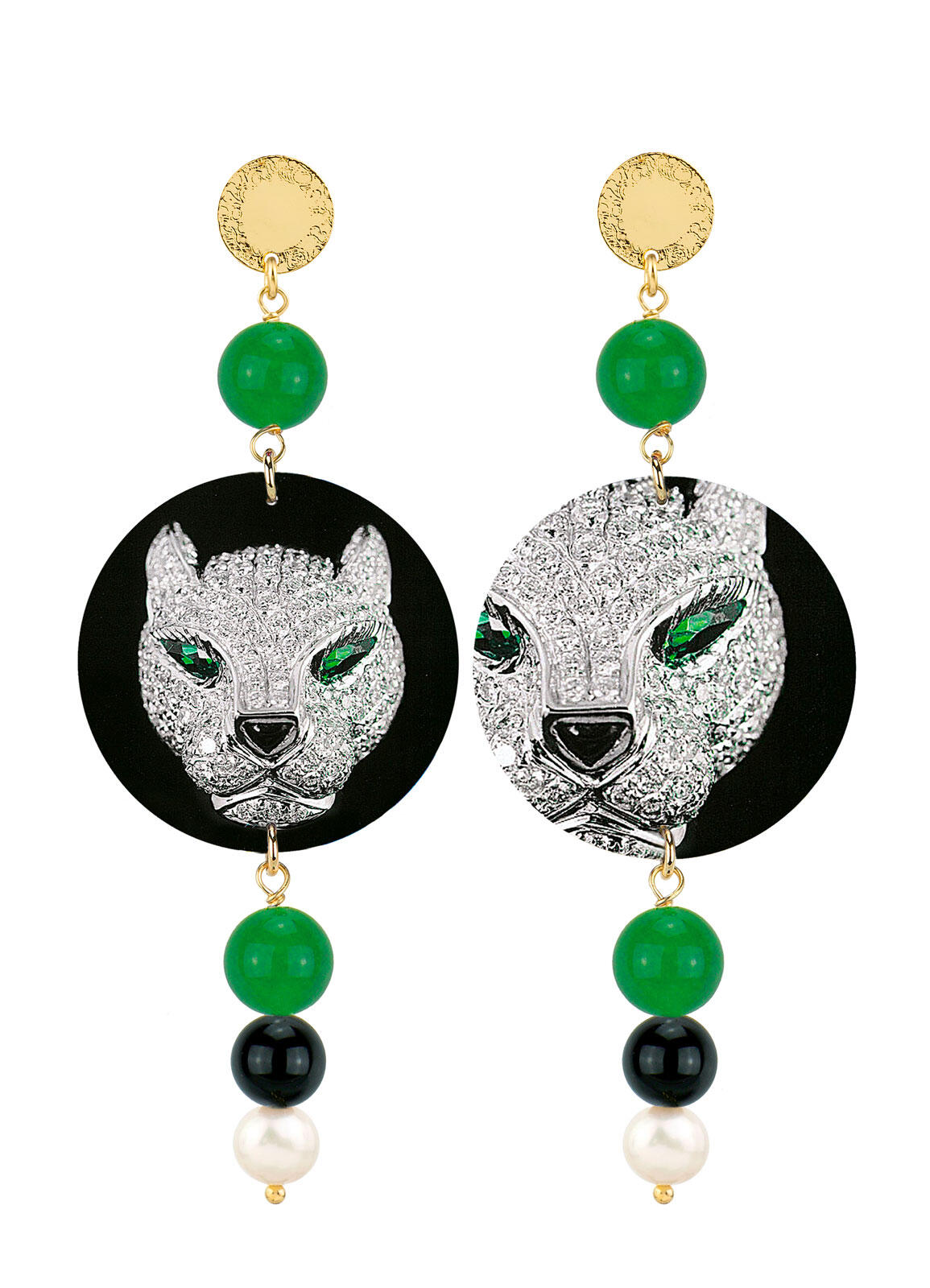 Orecchini composti da una capsula piatta stampata. Elementi in ottone galvanizzato oro e pietre naturali. Lunghezza 9 cm. Diametro 3,5 cm. Chiusura piattino e farfallina. Made in Italy
