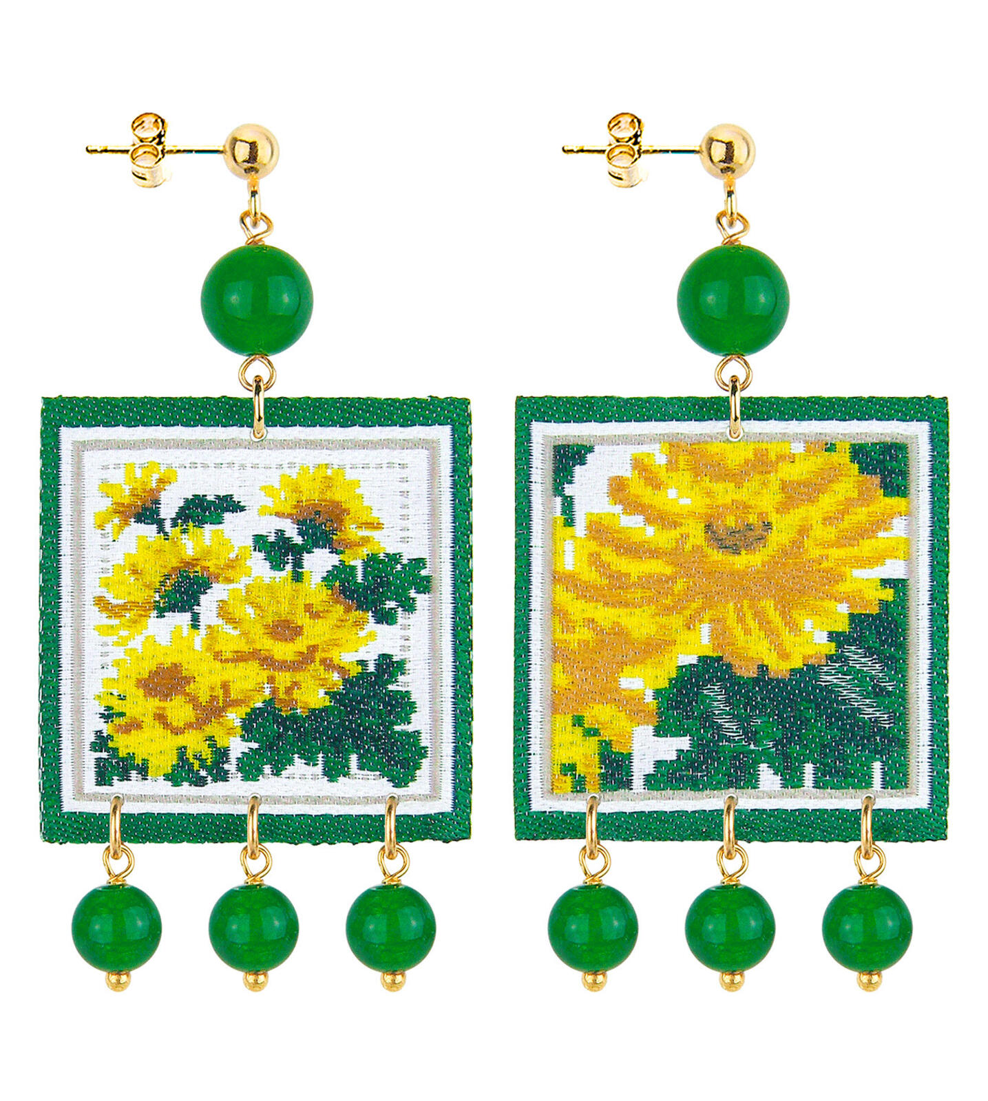 Etichetta quadrata ricamata montata in ottone galvanizzato oro e pietre naturali colorate. Lunghezza 6 cm. Made in Italy