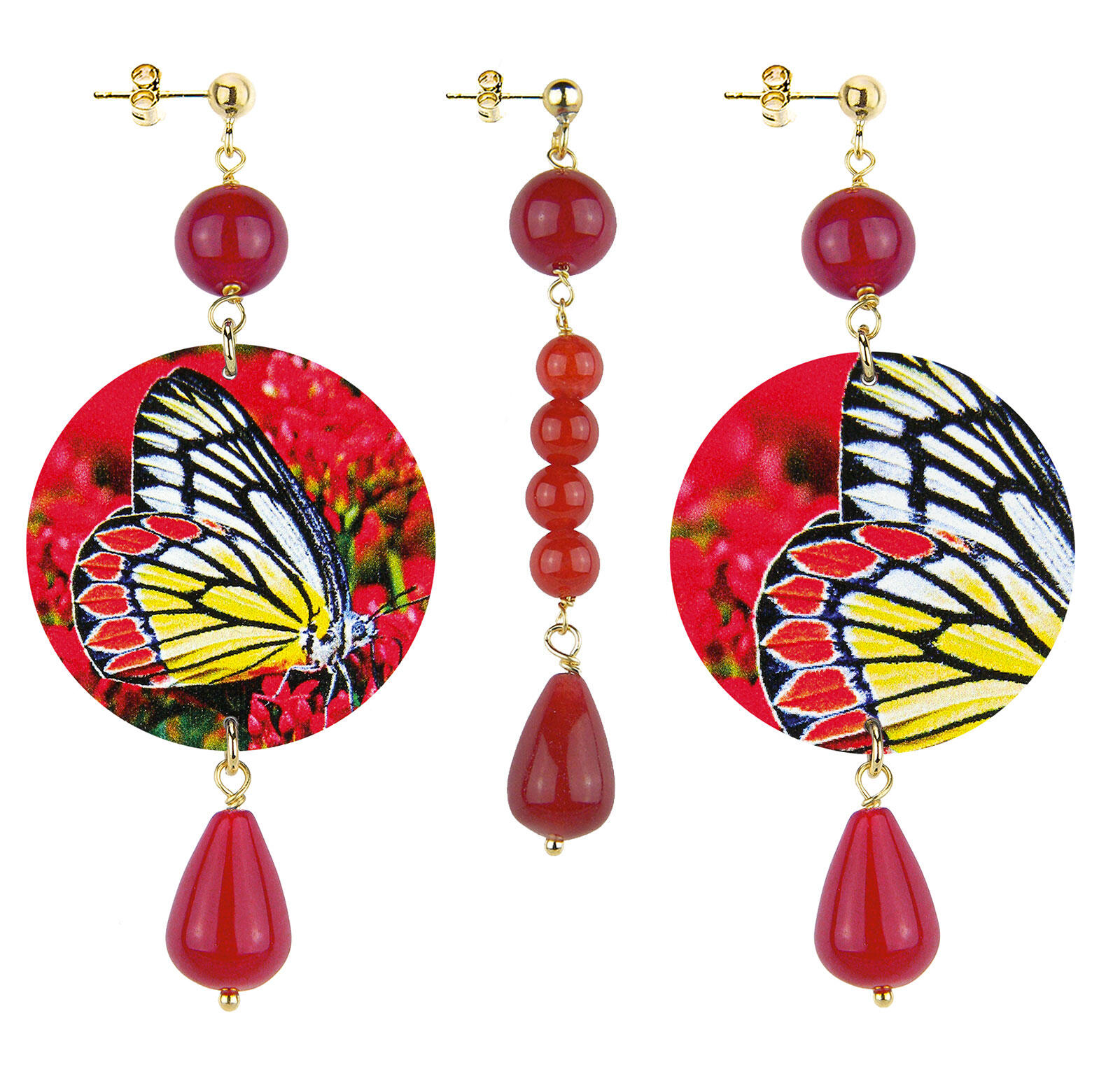 Orecchini composti da una capsula piatta stampata. Elementi in ottone galvanizzato oro e pietre naturali. Lunghezza 8,5 cm. Diametro 3,5 cm. Orecchino singolo in ottone galvanizzato oro e pietre naturali. Lunghezza 6,5 cm. Made in Italy