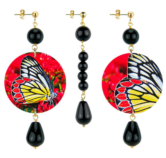Gli orecchini della collezione The Circle di Lebole Maison sono realizzati con capsule piatte stampate su banda stagnata, montati in ottone galvanizzato oro e pietre naturali. L’asimmetria è data dalle diverse immagini impresse nella capsula.