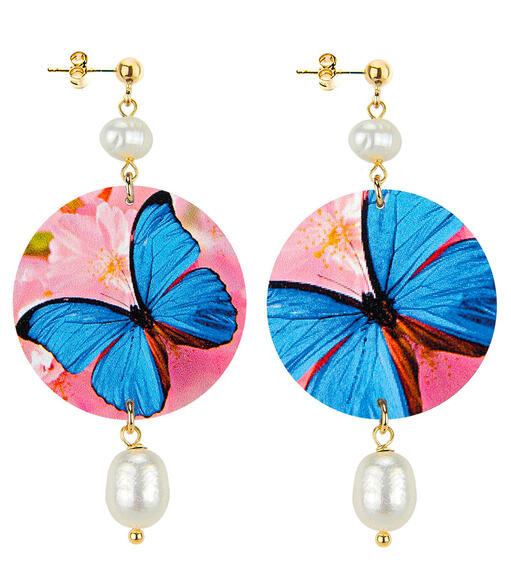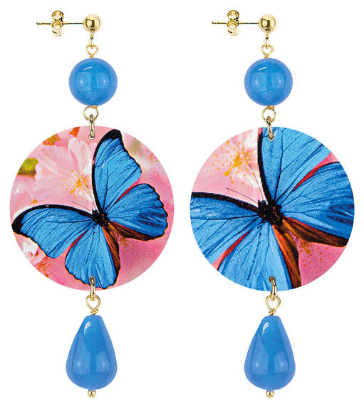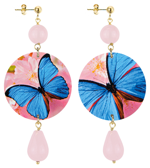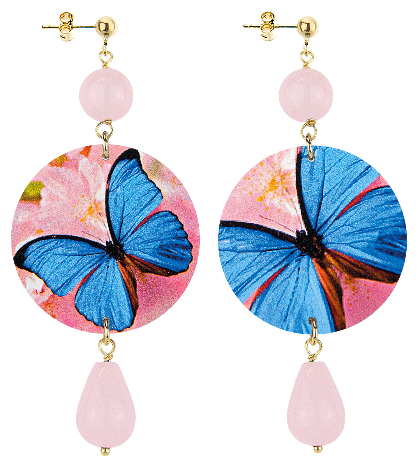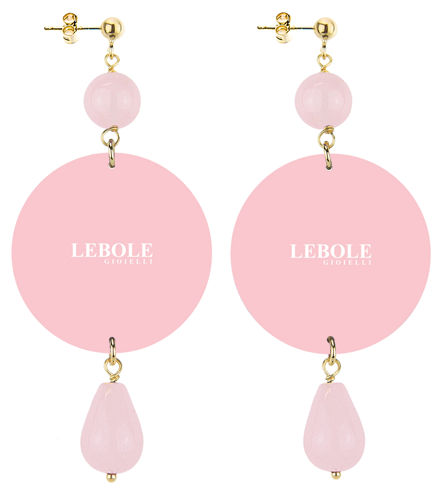 Orecchini composti da una capsula piatta stampata. Elementi in ottone galvanizzato oro e pietre naturali. Lunghezza 8,5 cm. Diametro 3,5 cm. Made in Italy
