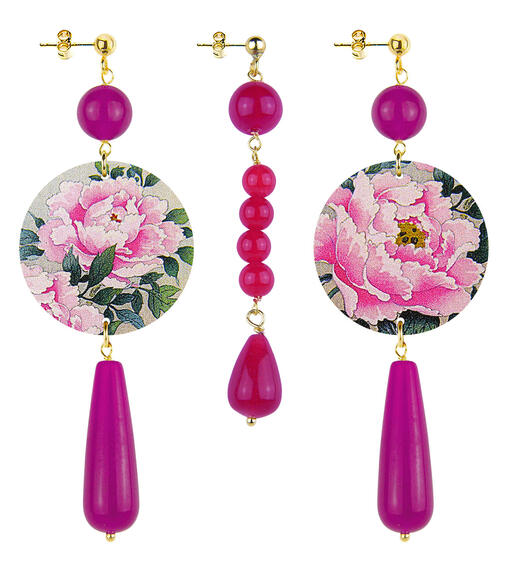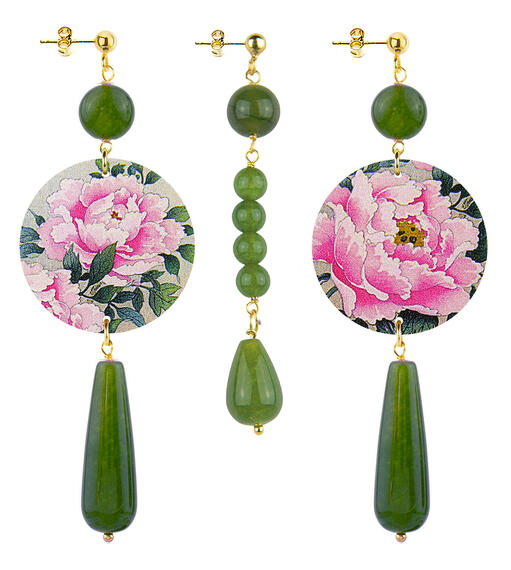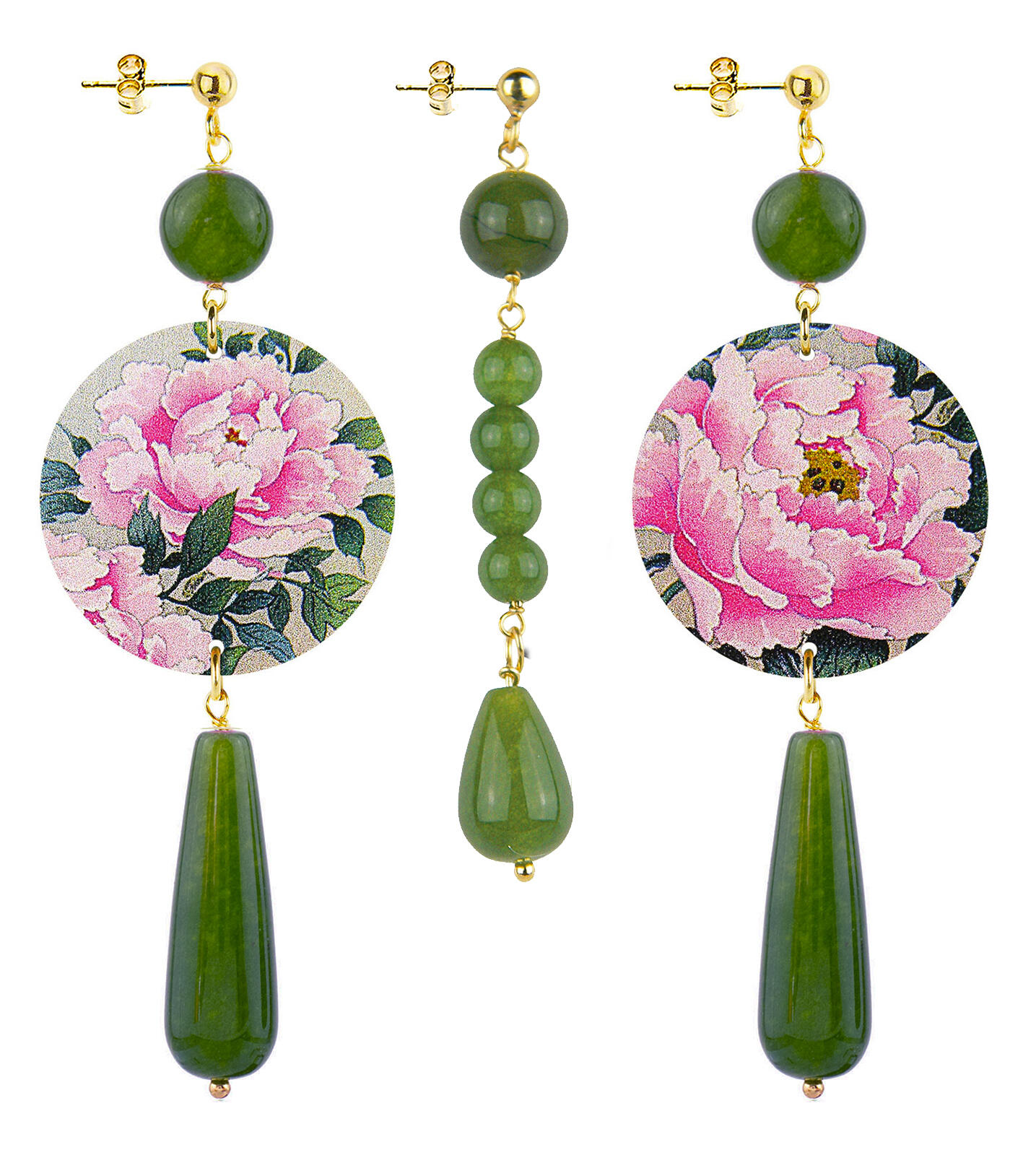 Orecchini composti da una capsula piatta stampata. Elementi in ottone galvanizzato oro e pietre naturali. Lunghezza 8.5 cm. Diametro 3cm. Orecchino singolo in ottone galvanizzato oro e pietre naturali. Lunghezza 6,5 cm. Made in Italy