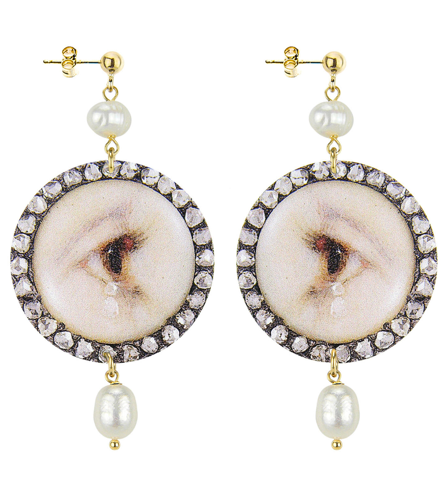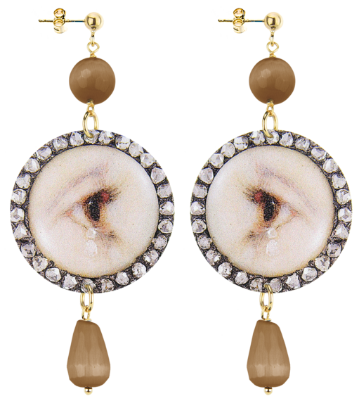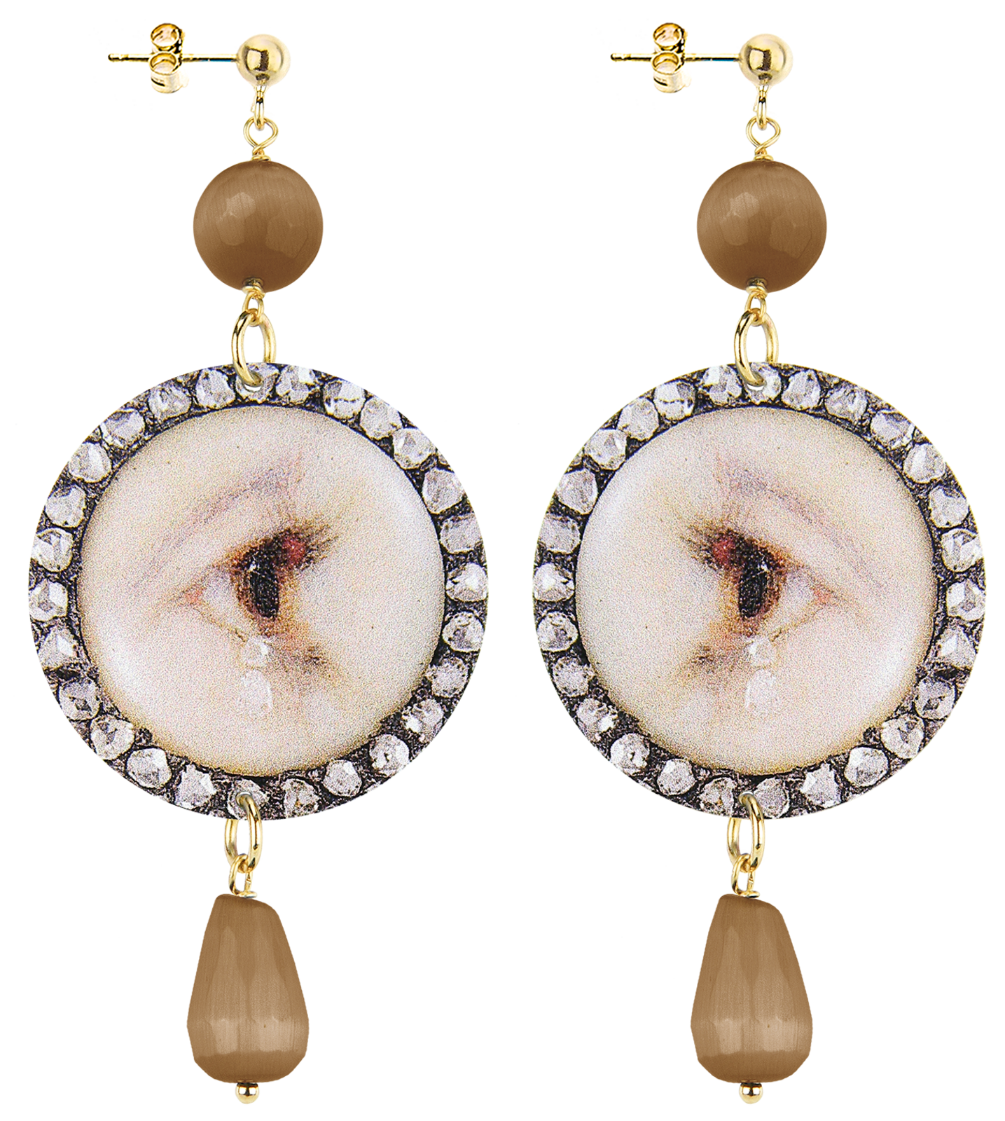 Gli orecchini della collezione The Circle di Lebole Maison sono realizzati con capsule piatte stampate su banda stagnata, montati in ottone galvanizzato oro e pietre naturali. L’asimmetria è data dalle diverse immagini impresse nella capsula.