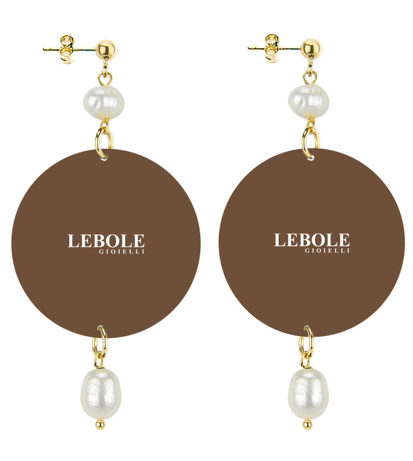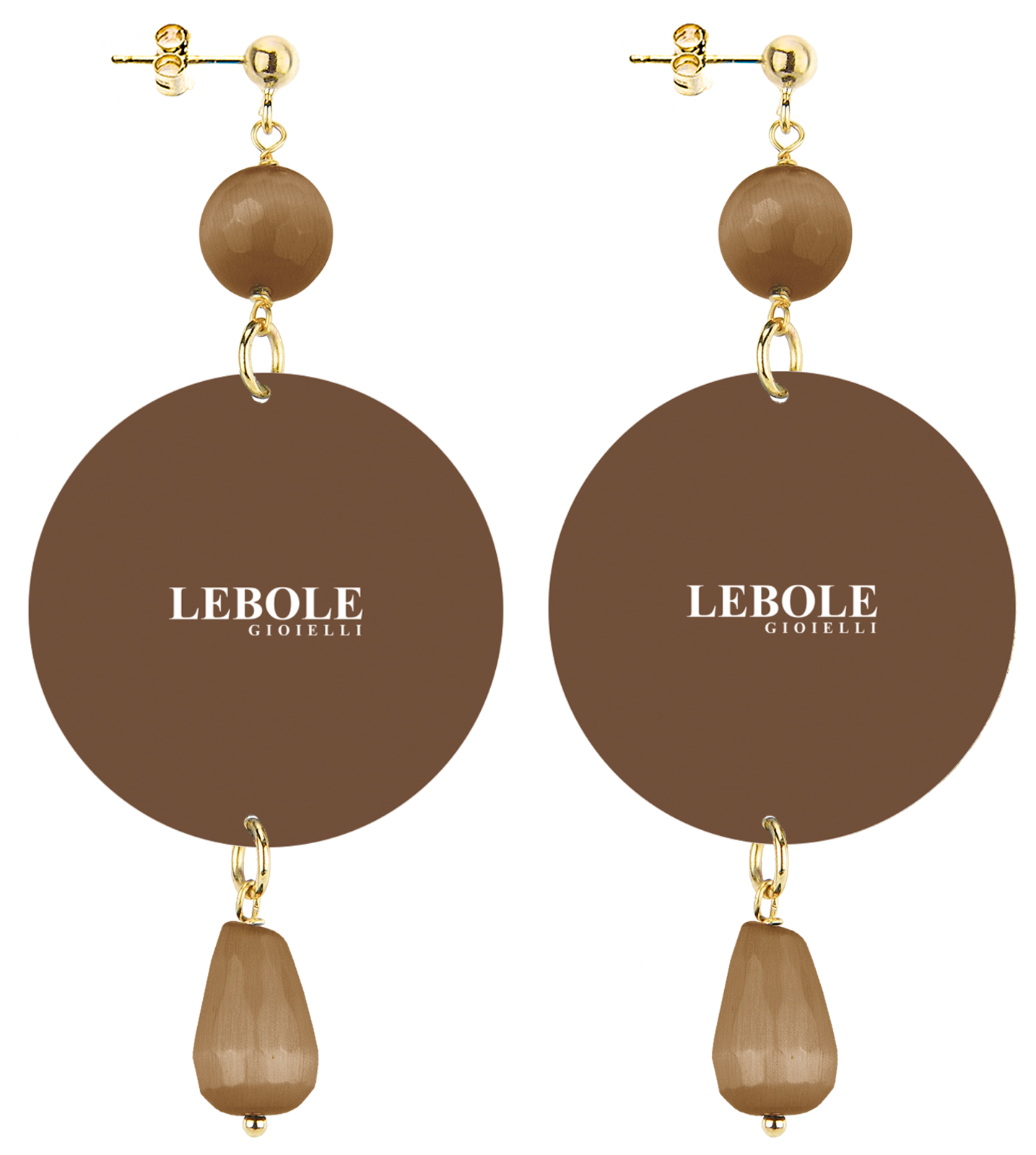 Orecchini composti da una capsula piatta stampata. Elementi in ottone galvanizzato oro e pietre naturali. Lunghezza 8,5 cm. Diametro 3,5 cm. Made in Italy