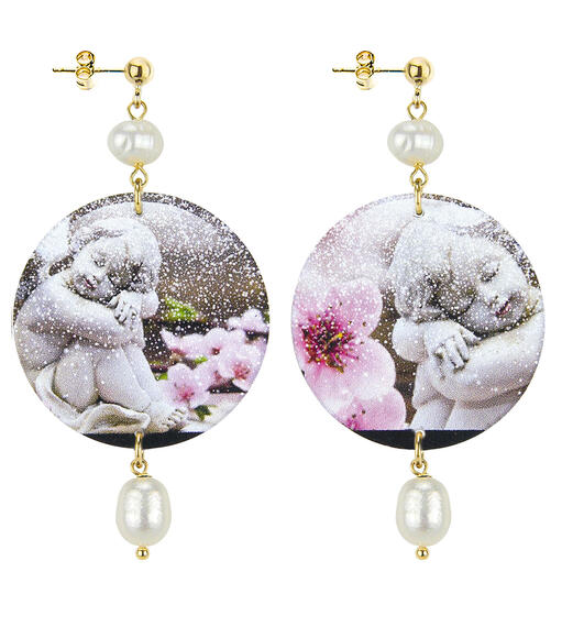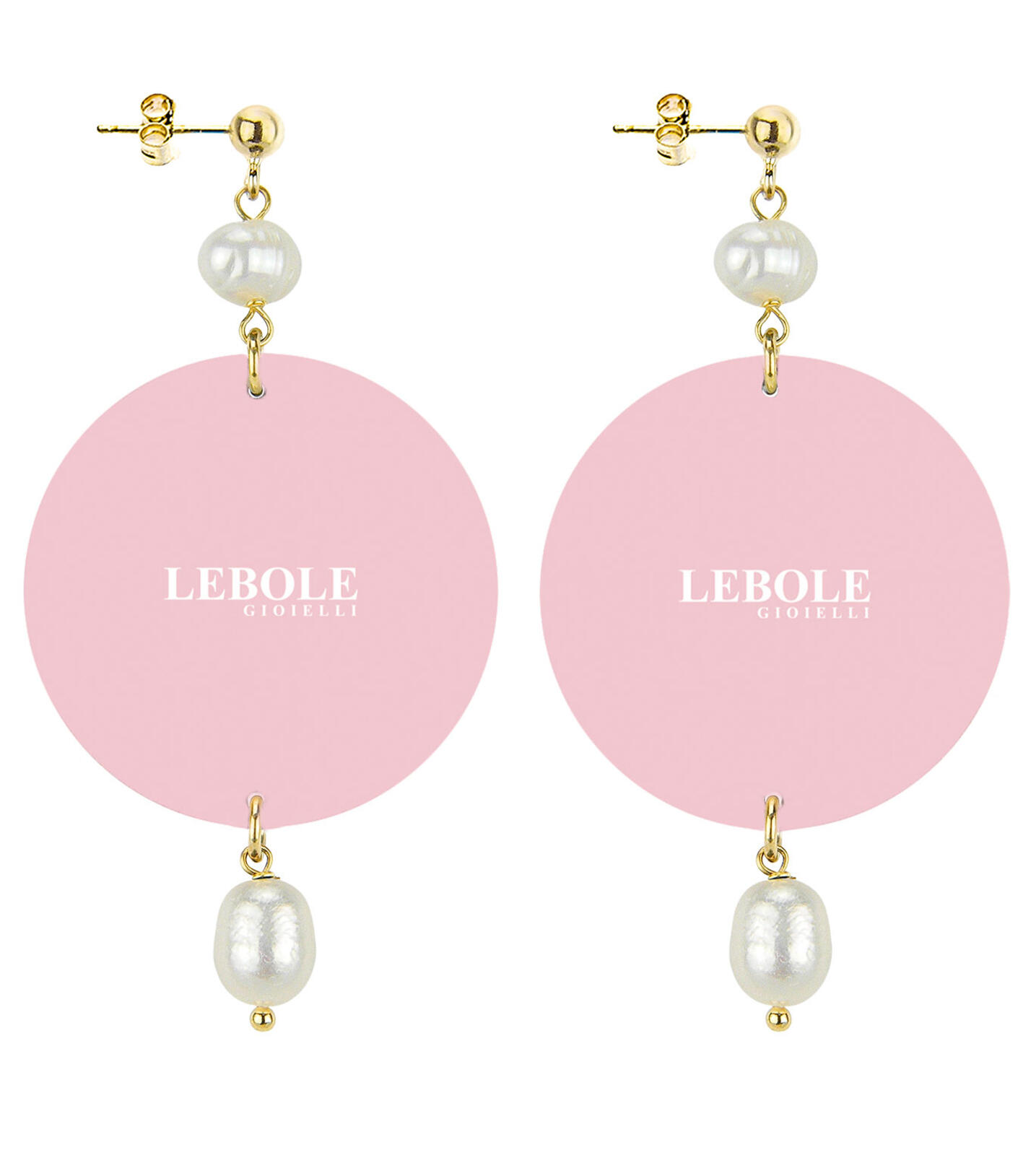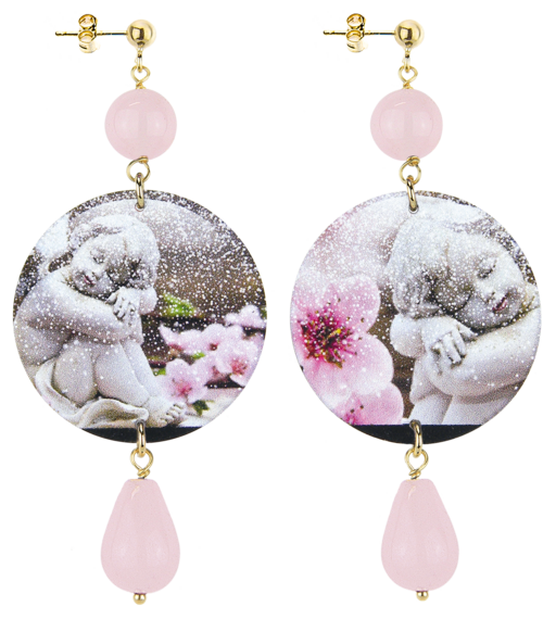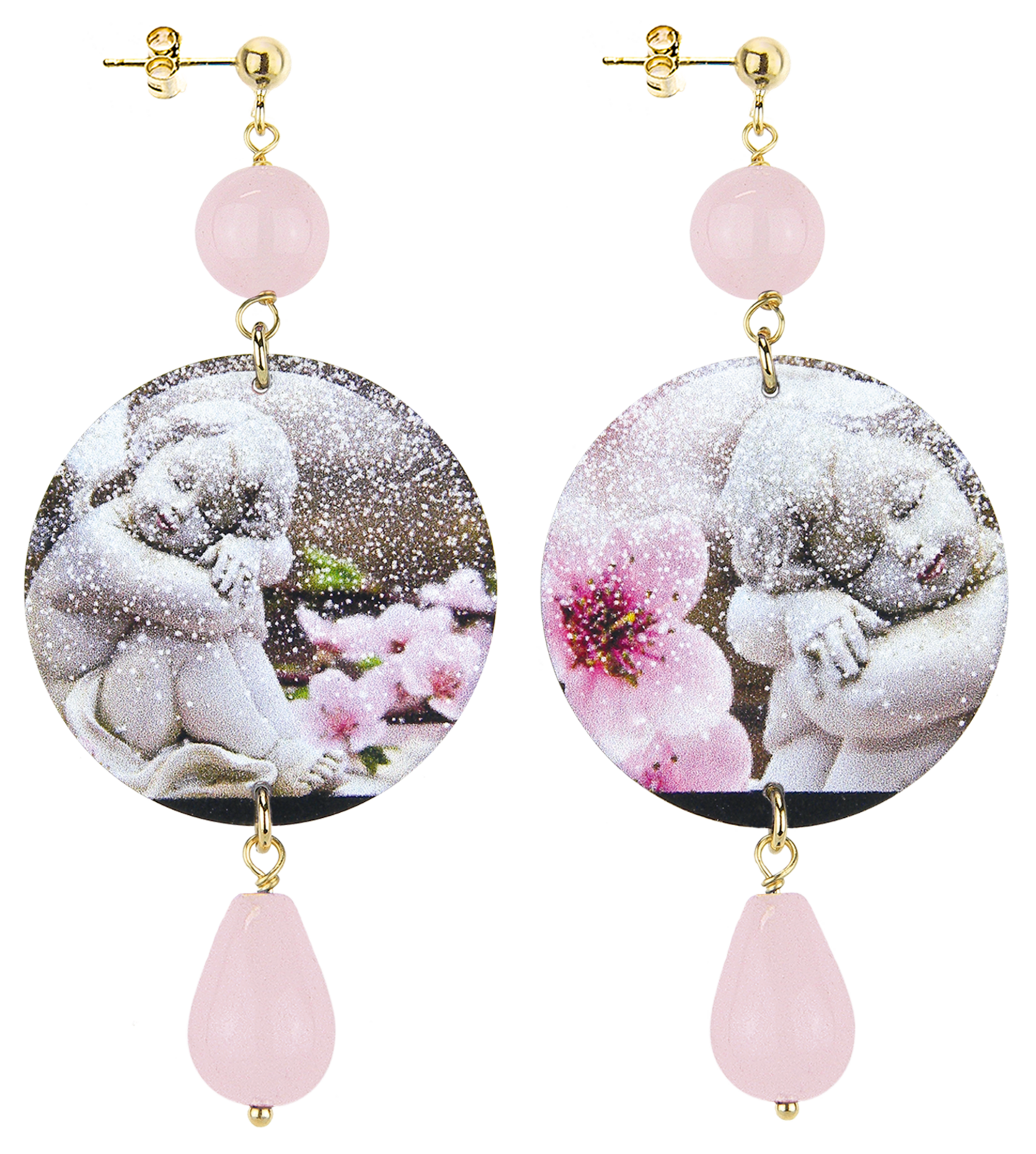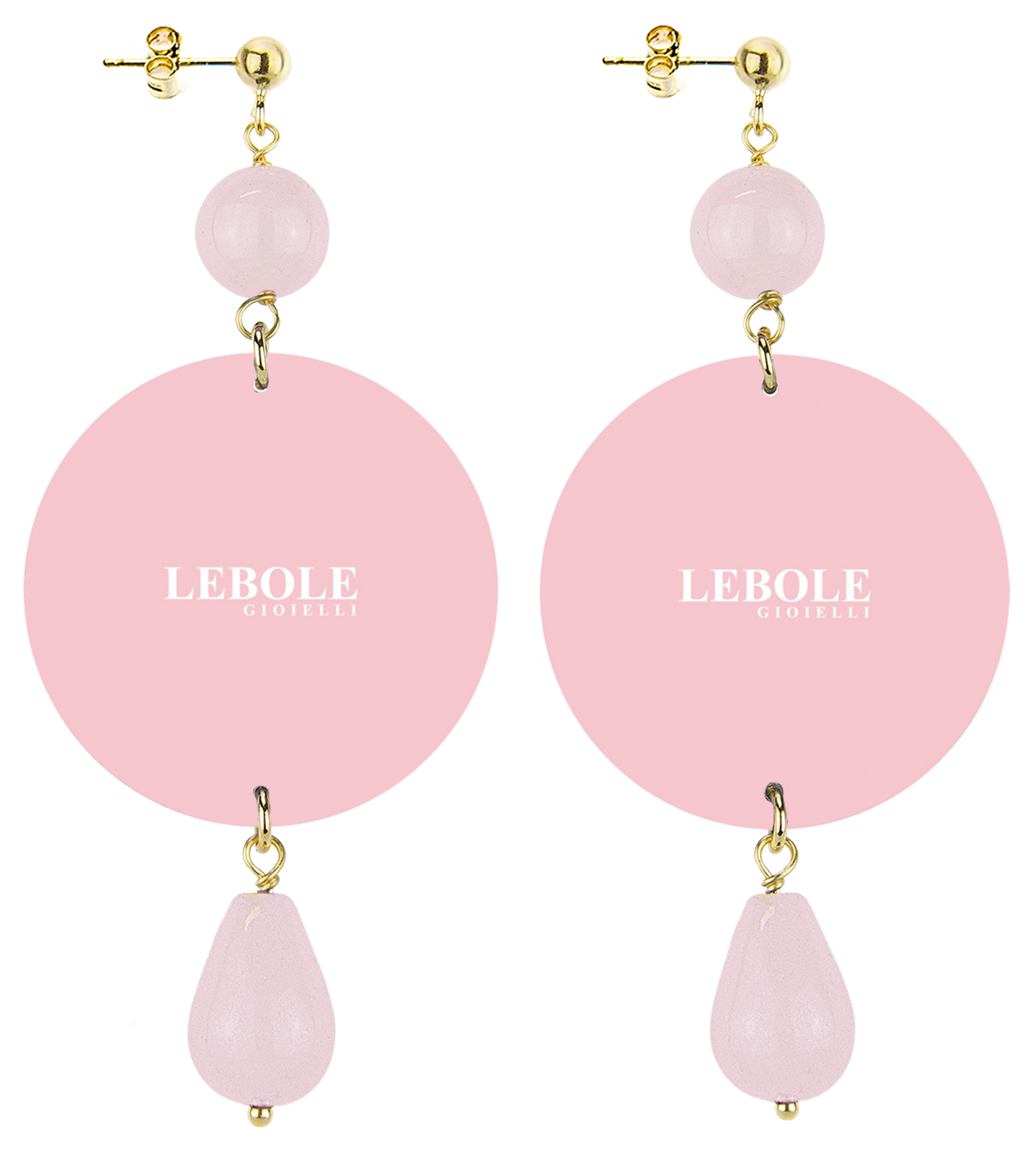 Orecchini composti da una capsula piatta stampata. Elementi in ottone galvanizzato oro e pietre naturali. Lunghezza 8,5 cm. Diametro 3,5 cm. Made in Italy