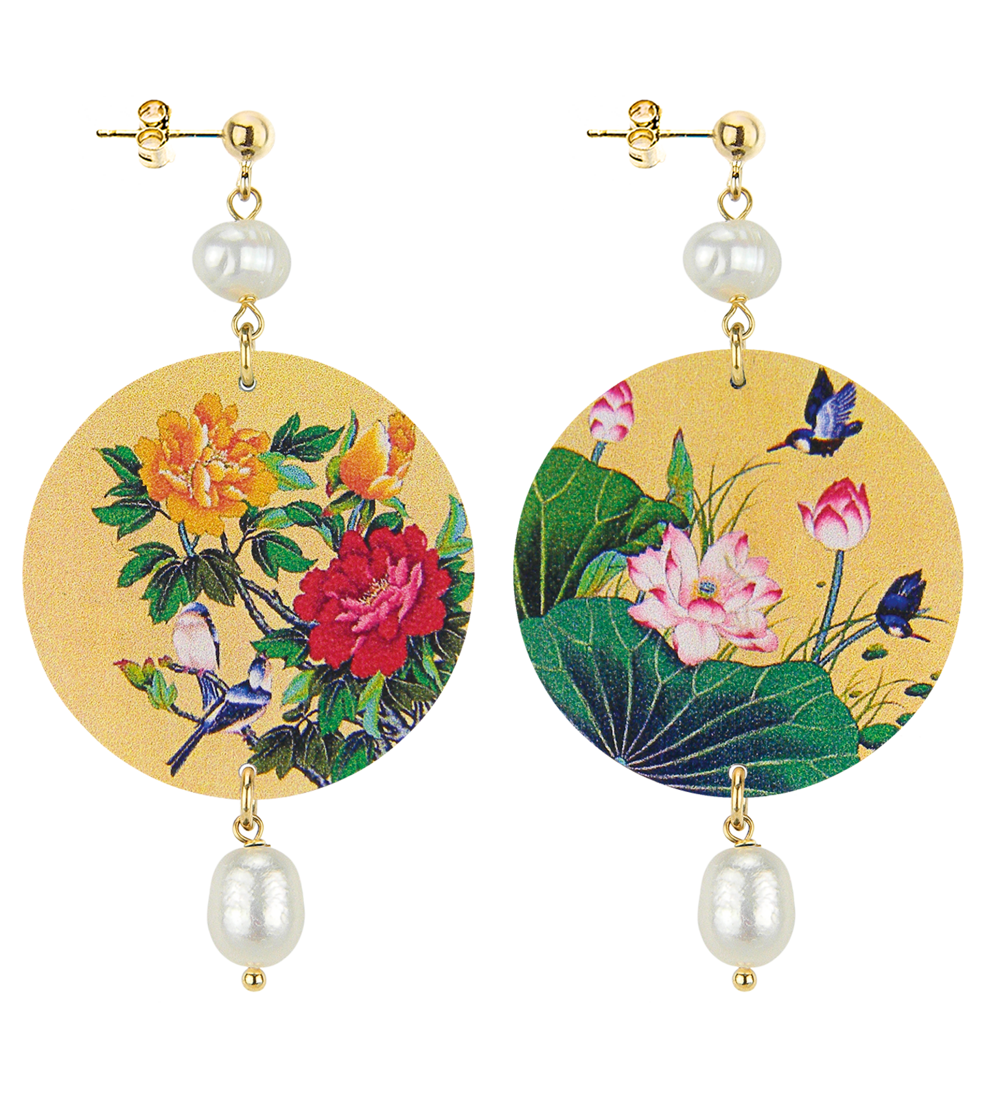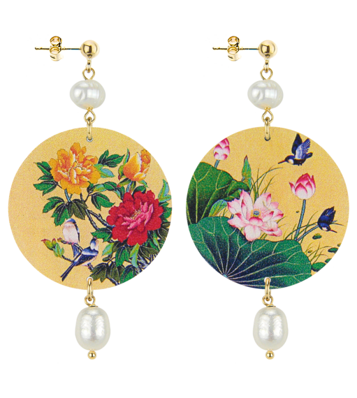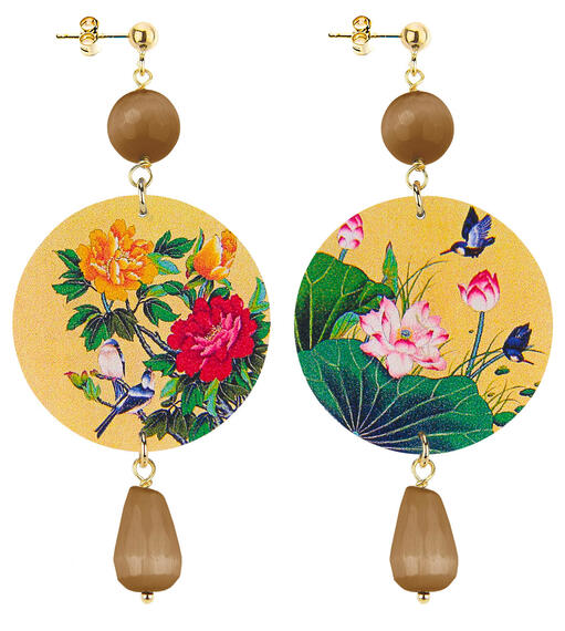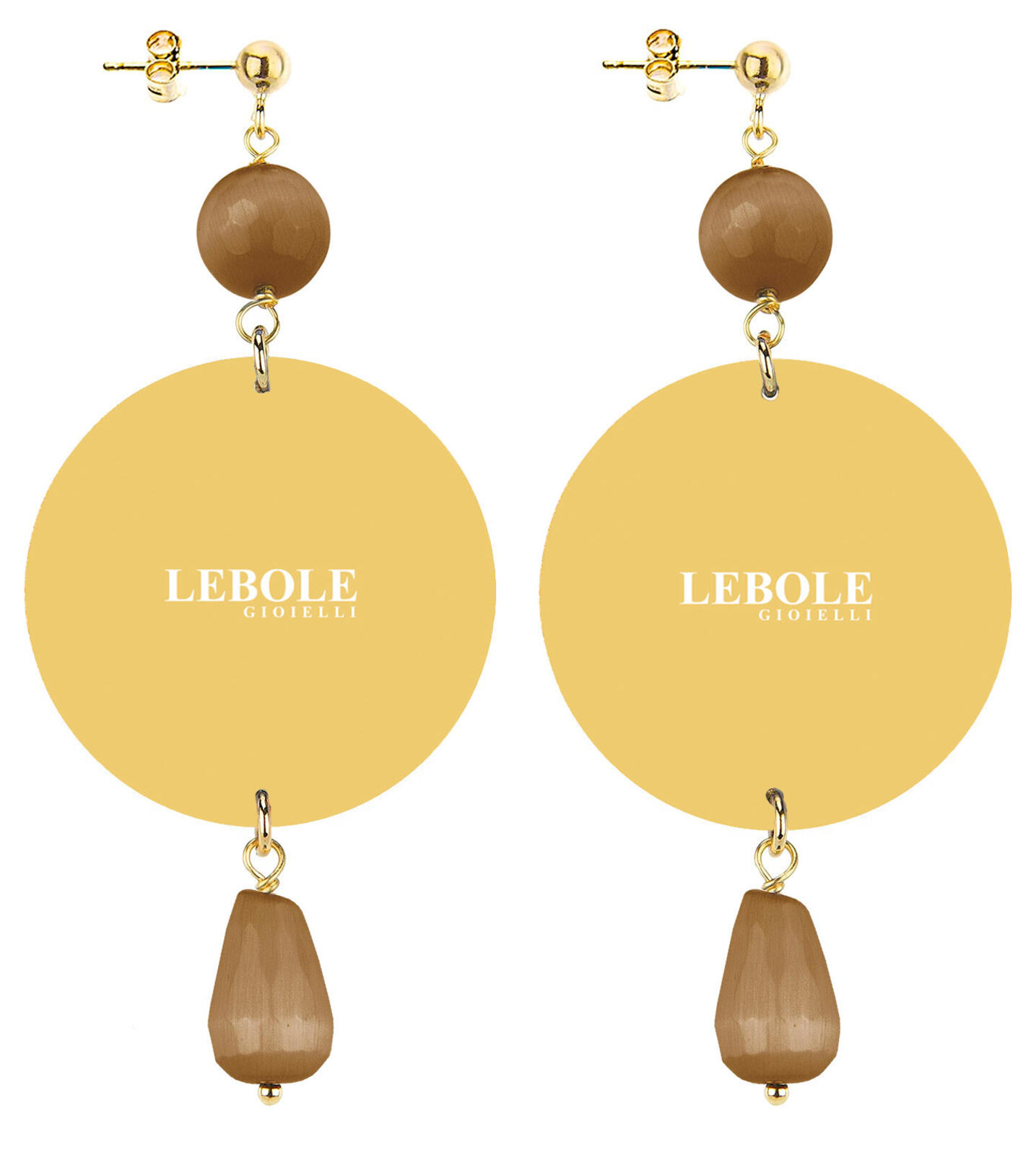 Orecchino composto da una capsula piatta stampata. Elementi in ottone galvanizzato oro e pietre naturali. Lunghezza 8 cm. Diametro 3.5 cm. Made in Italy