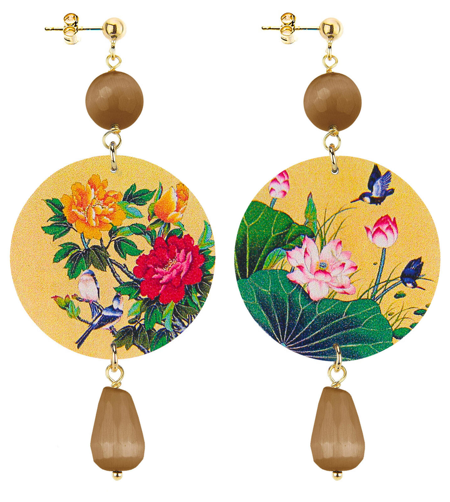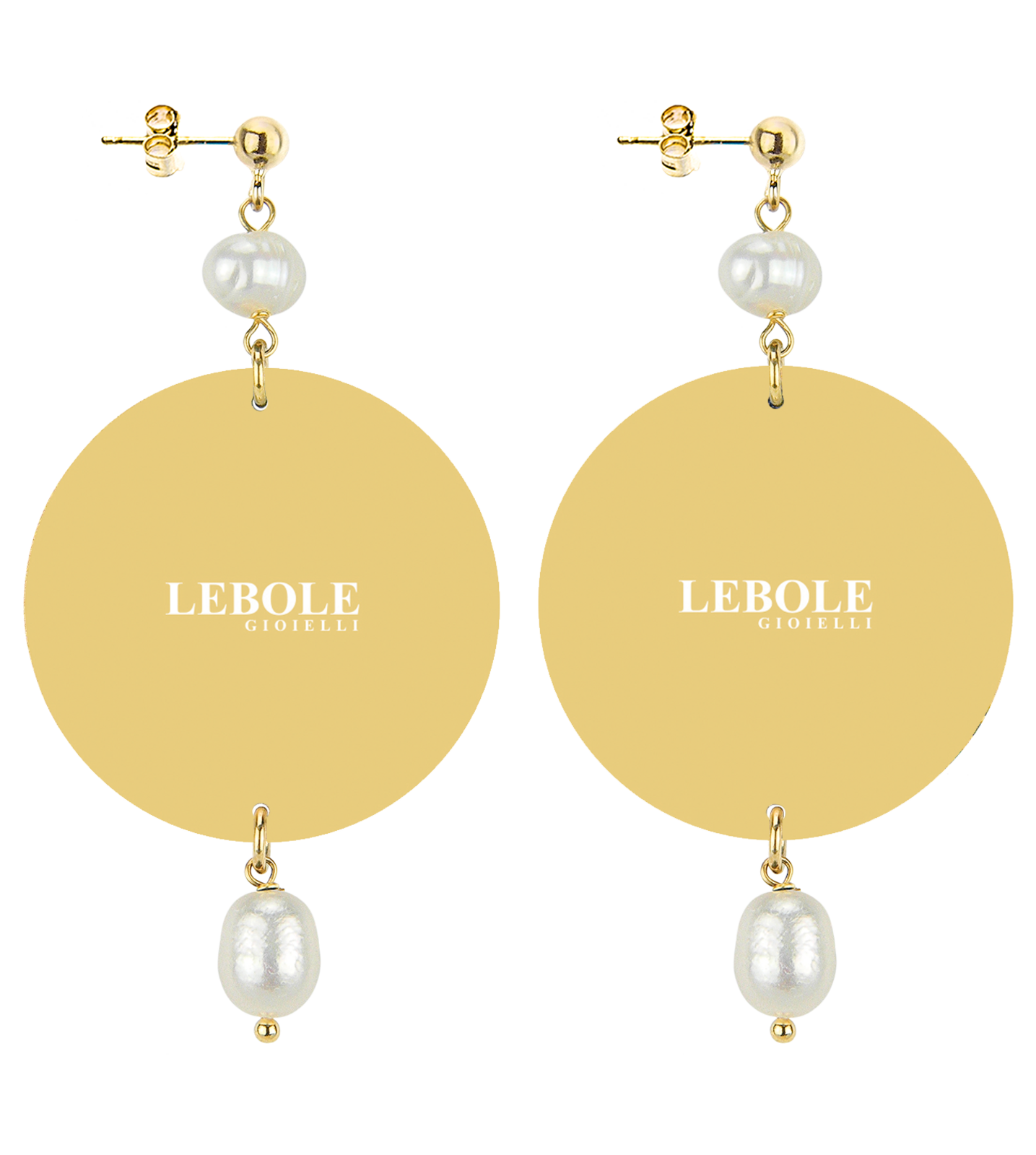 Gli orecchini della collezione The Circle di Lebole Maison sono realizzati con capsule piatte stampate su banda stagnata, montati in ottone galvanizzato oro e pietre naturali. L’asimmetria è data dalle diverse immagini impresse nella capsula.