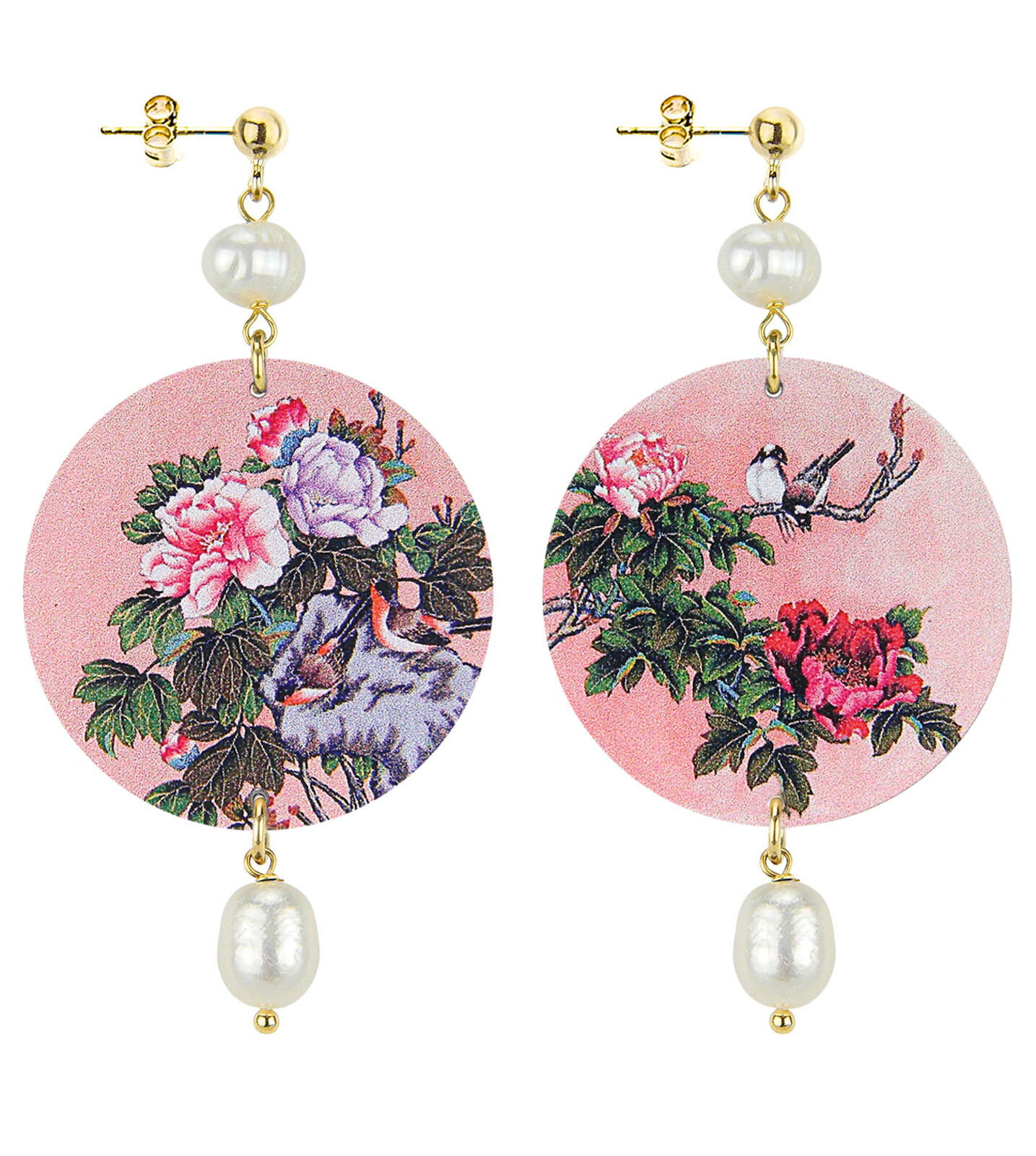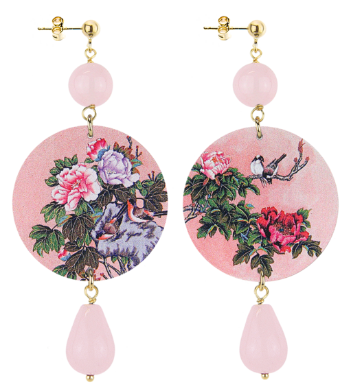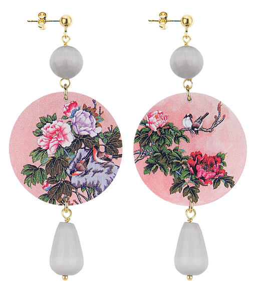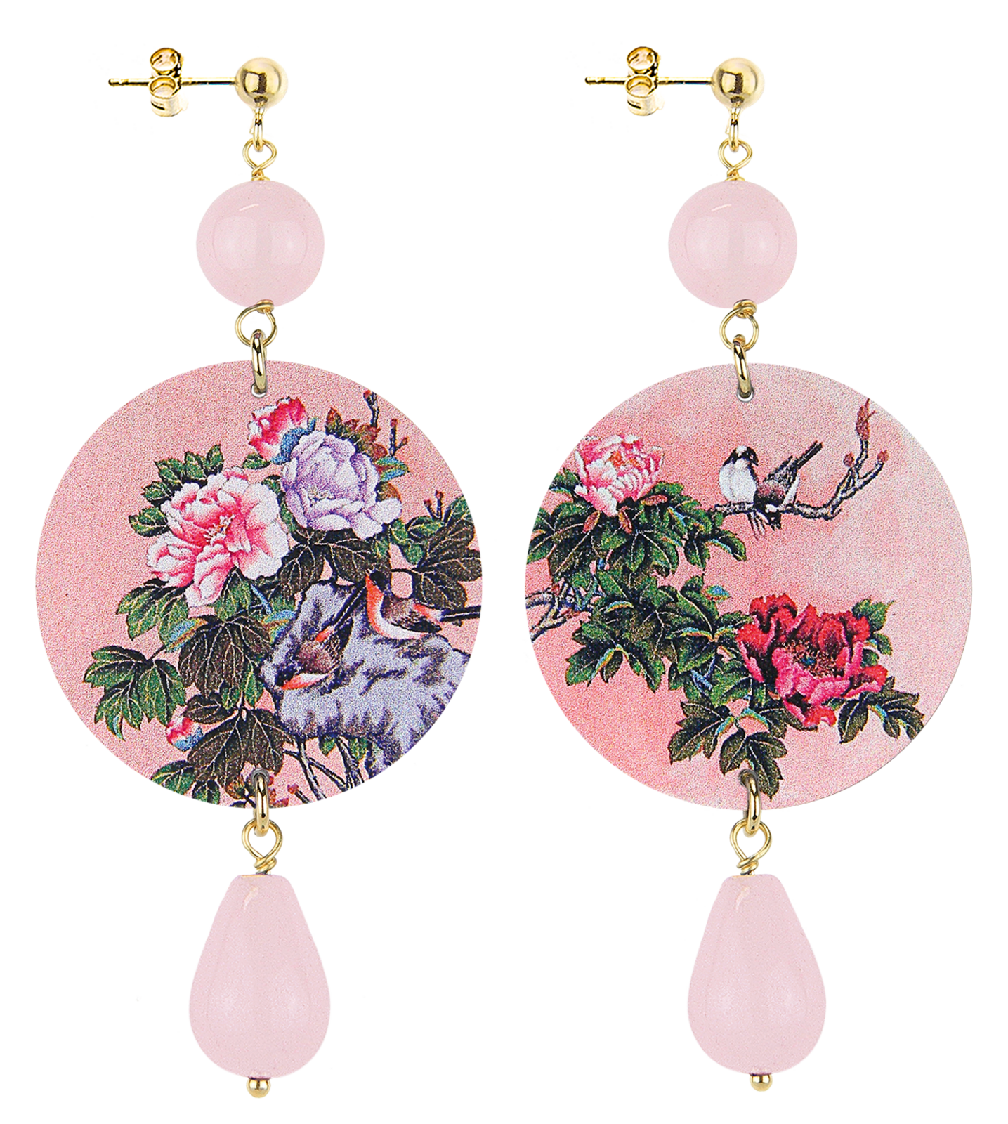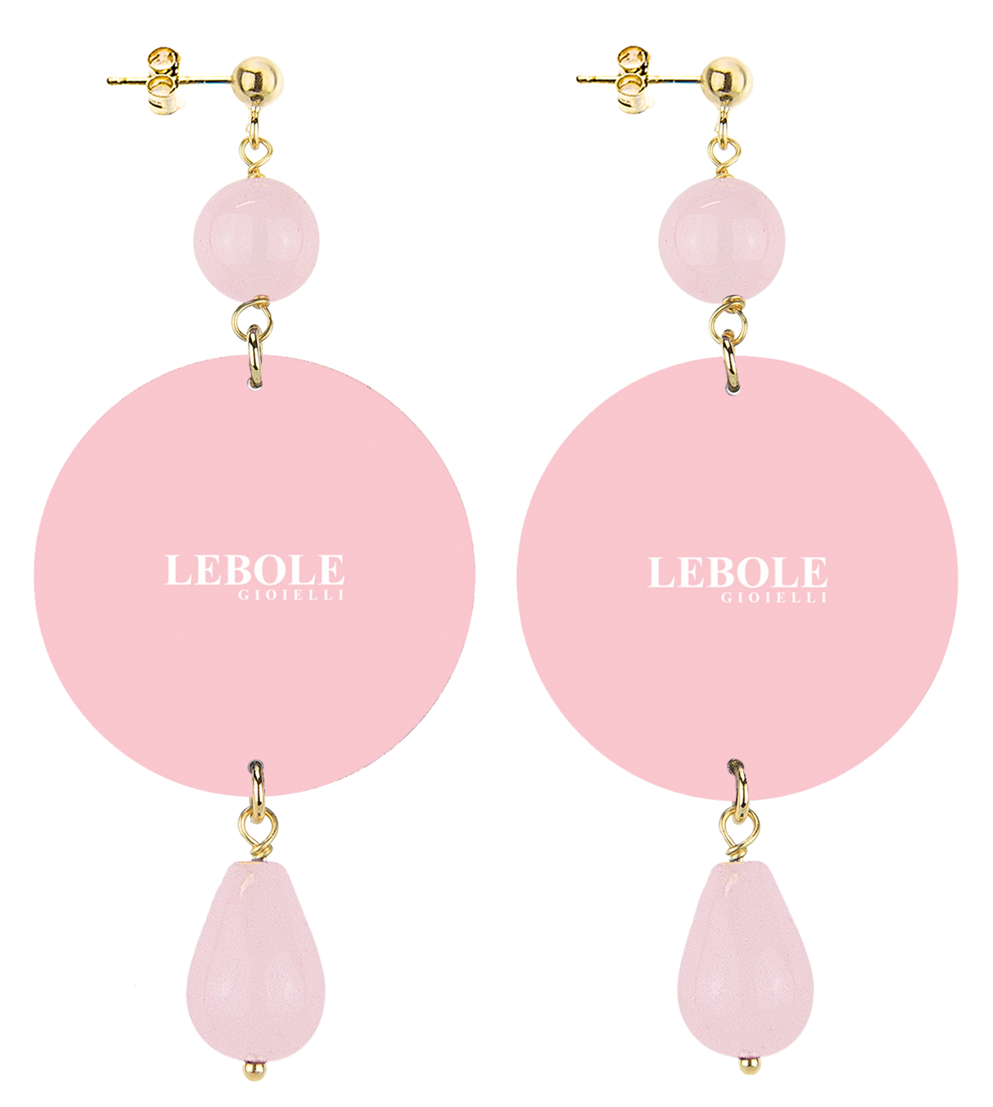 Orecchini composti da una capsula piatta stampata. Elementi in ottone galvanizzato oro e pietre naturali. Lunghezza 8,5 cm. Diametro 3.5 cm. Made in Italy