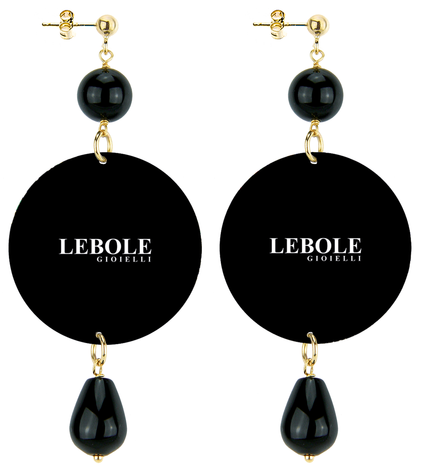 Orecchini composti da una capsula piatta stampata. Elementi in ottone galvanizzato oro e pietre naturali. Lunghezza 8,5 cm. Diametro 3,5 cm. Made in Italy