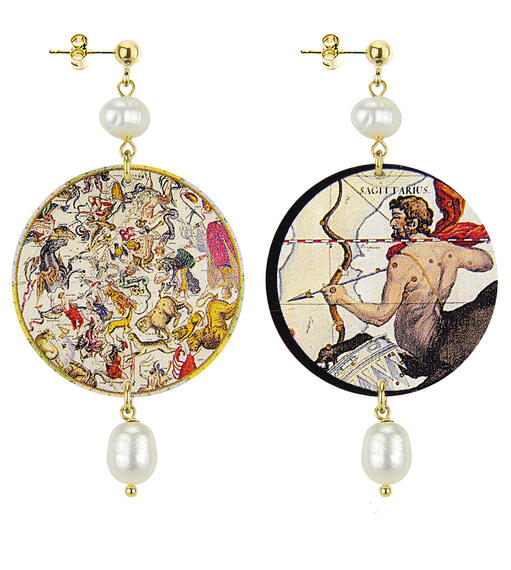 Gli orecchini della collezione The Circle di Lebole Maison sono realizzati con capsule piatte stampate su banda stagnata, montati in ottone galvanizzato oro e pietre naturali. L’asimmetria è data dalle diverse immagini impresse nella capsula.