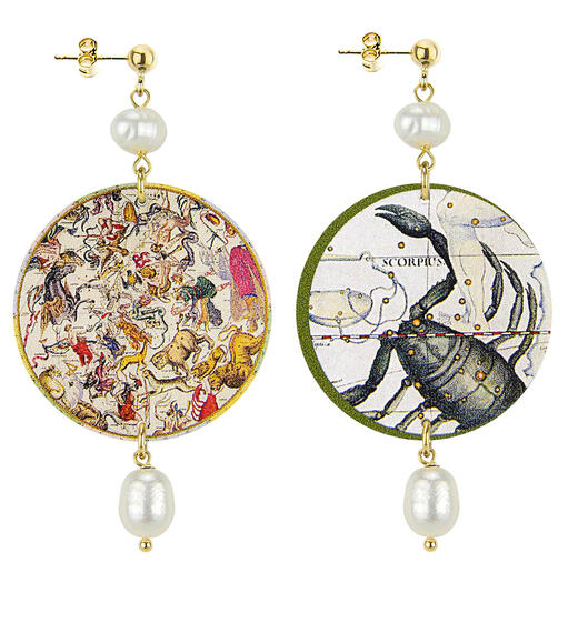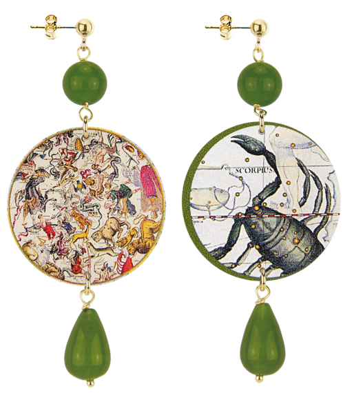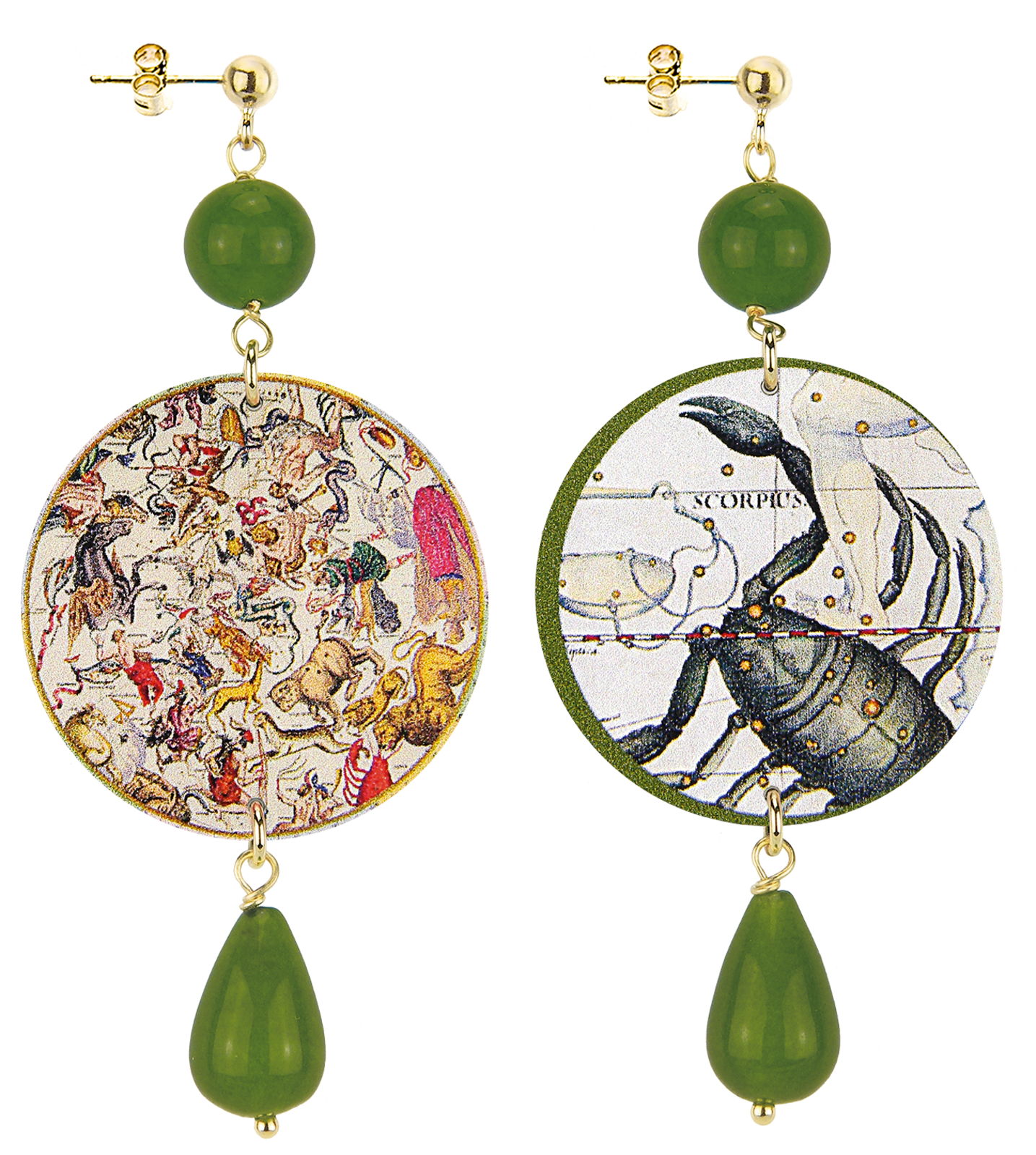 Gli orecchini della collezione The Circle di Lebole Maison sono realizzati con capsule piatte stampate su banda stagnata, montati in ottone galvanizzato oro e pietre naturali. L’asimmetria è data dalle diverse immagini impresse nella capsula.