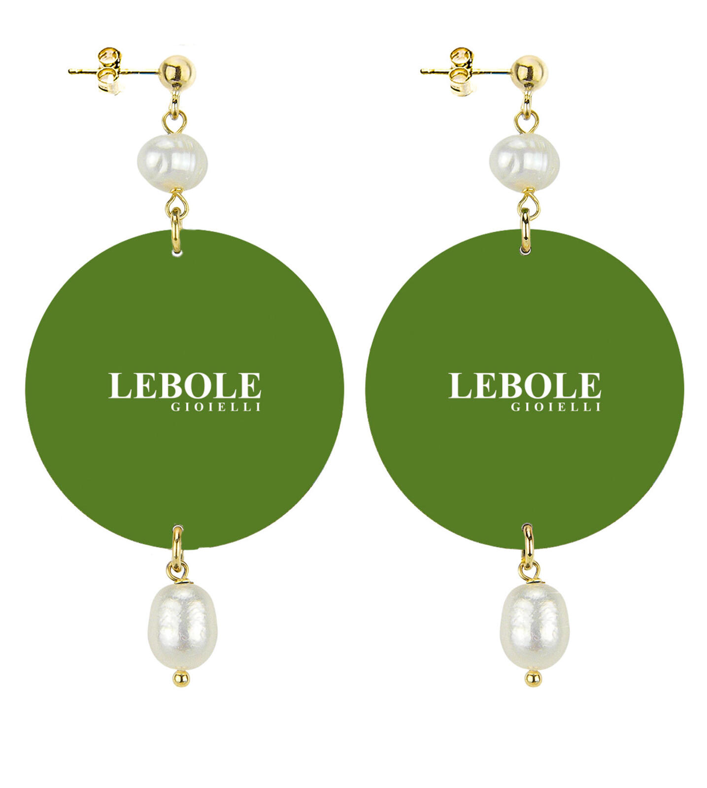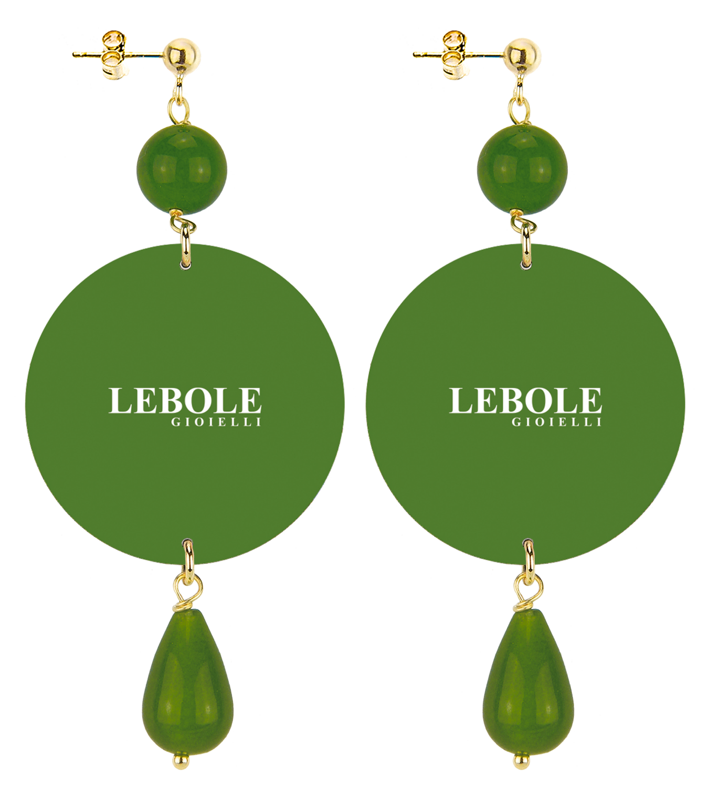 Orecchini composti da una capsula piatta stampata. Elementi in ottone galvanizzato oro e pietre naturali. Lunghezza 8,5 cm. Diametro 3,5 cm. Made in Italy