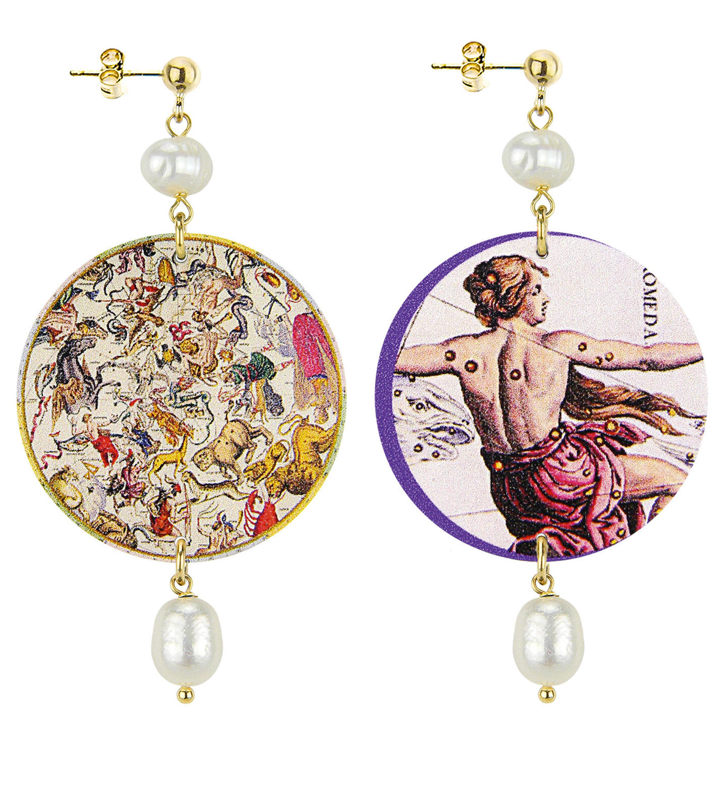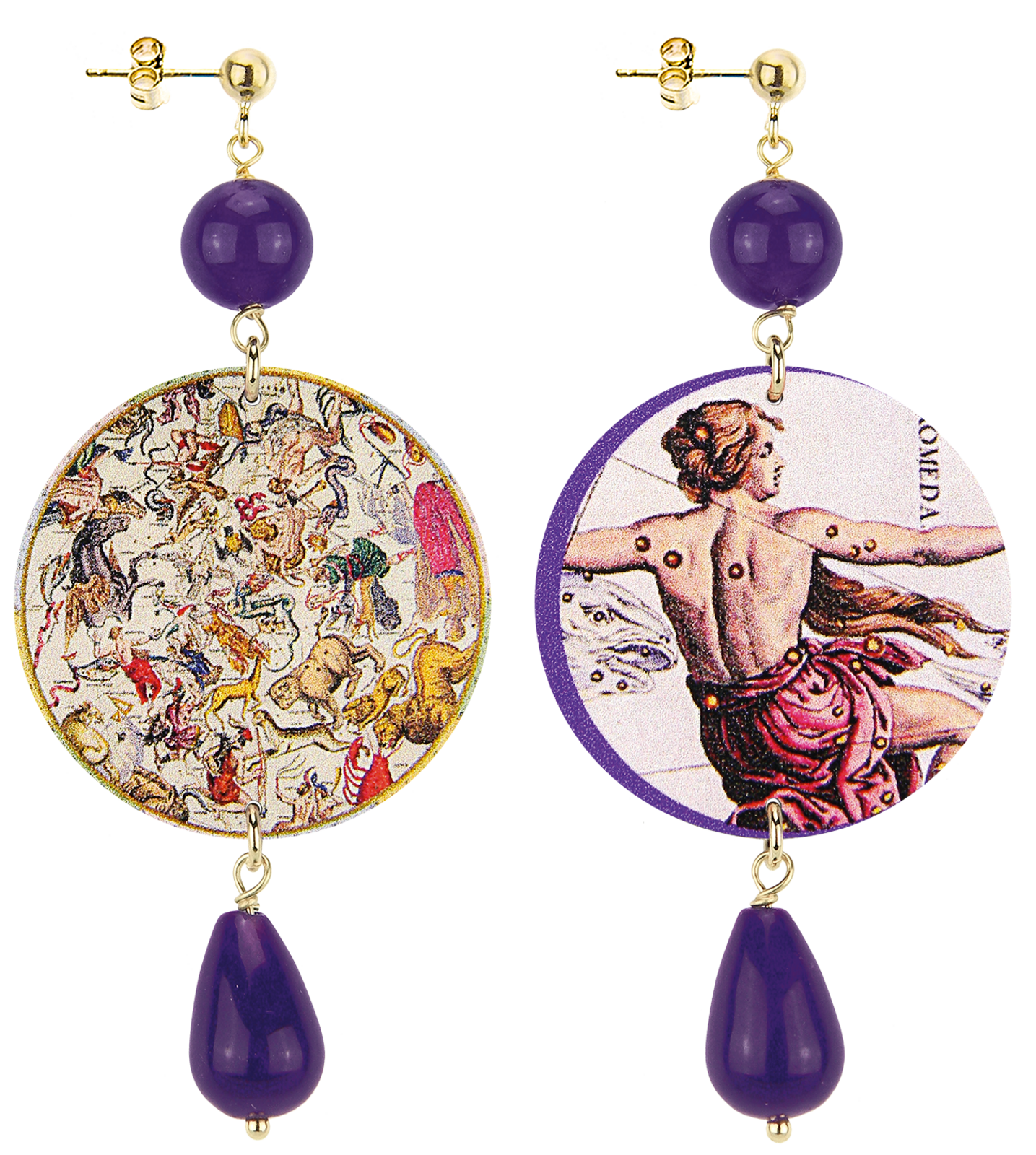 Gli orecchini della collezione The Circle di Lebole Maison sono realizzati con capsule piatte stampate su banda stagnata, montati in ottone galvanizzato oro e pietre naturali. L’asimmetria è data dalle diverse immagini impresse nella capsula.