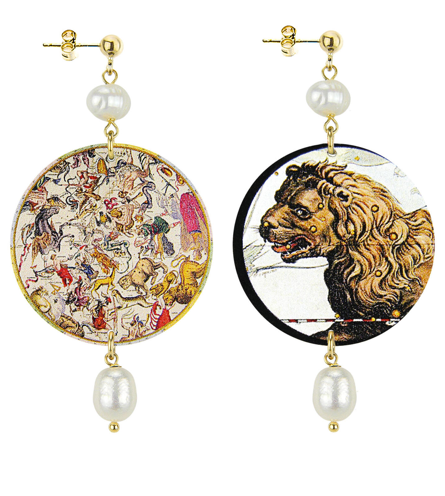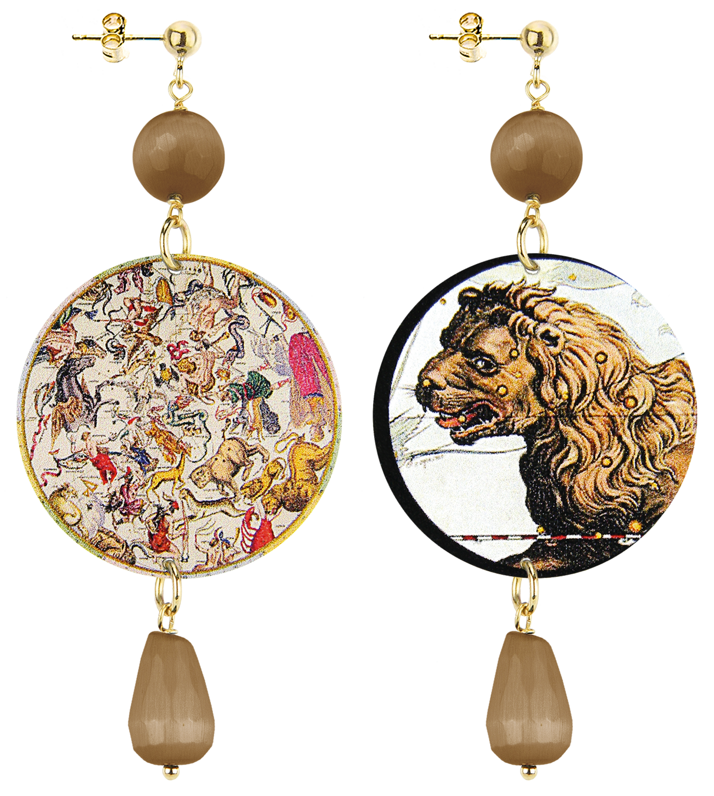 Gli orecchini della collezione The Circle di Lebole Maison sono realizzati con capsule piatte stampate su banda stagnata, montati in ottone galvanizzato oro e pietre naturali. L’asimmetria è data dalle diverse immagini impresse nella capsula.