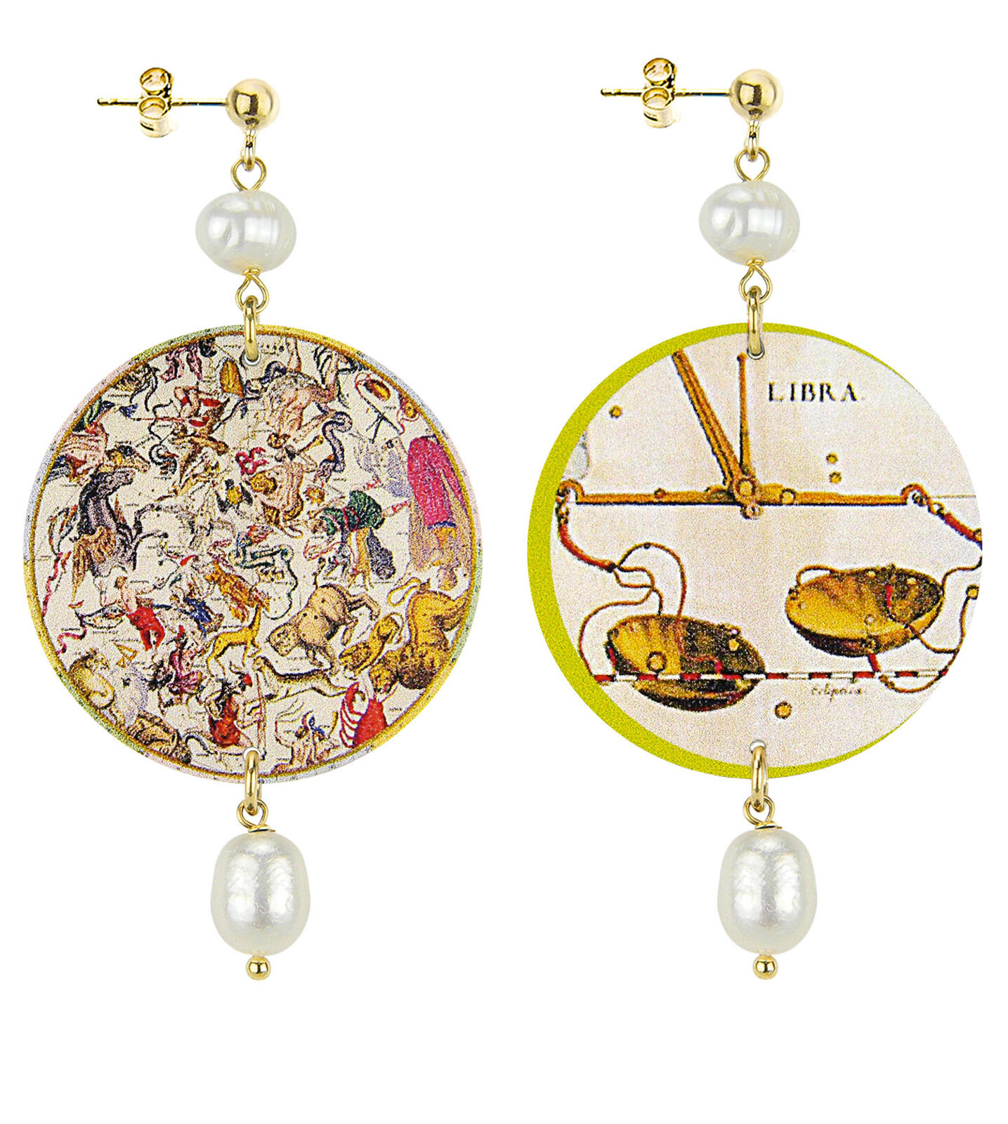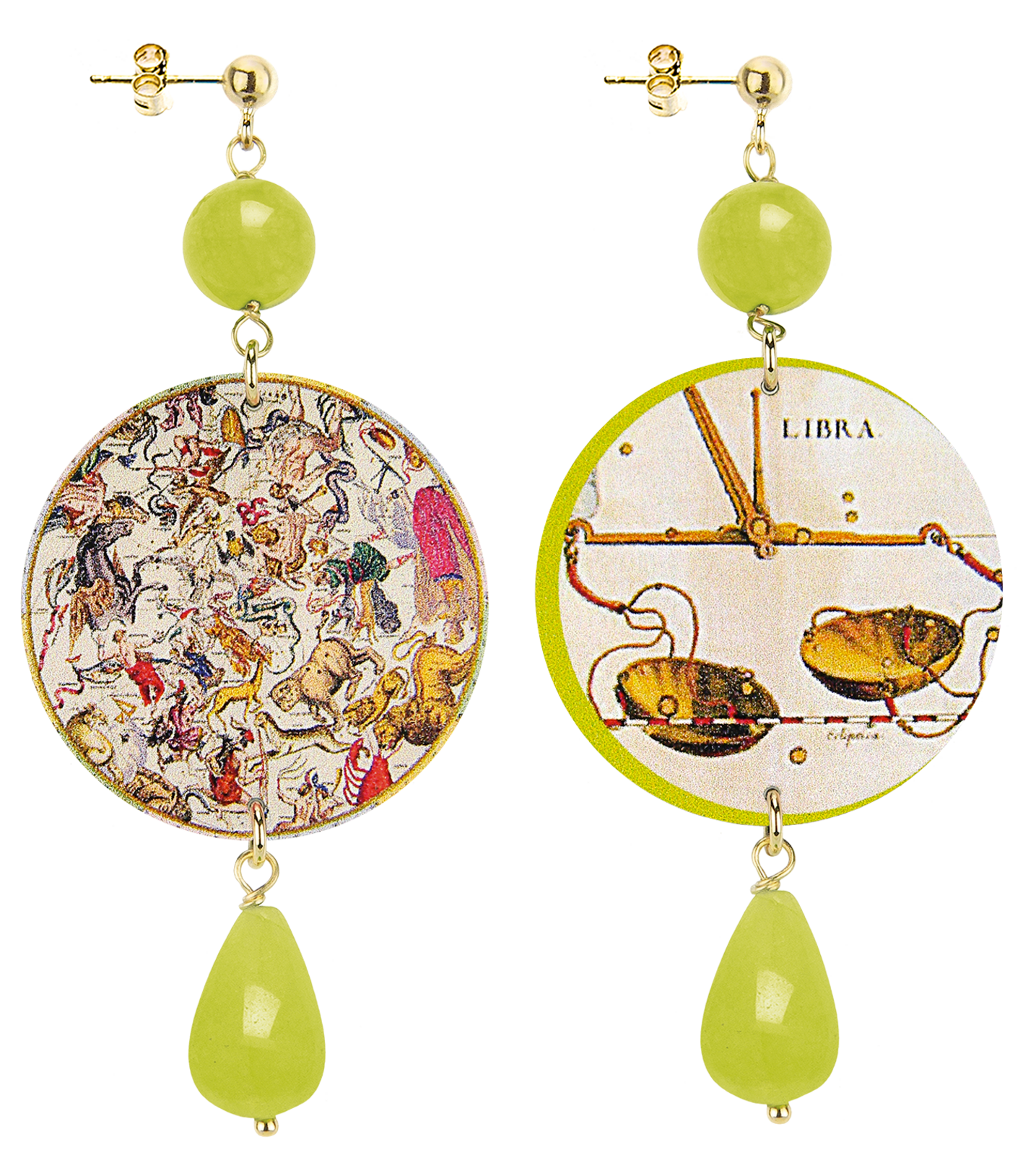 Gli orecchini della collezione The Circle di Lebole Maison sono realizzati con capsule piatte stampate su banda stagnata, montati in ottone galvanizzato oro e pietre naturali. L’asimmetria è data dalle diverse immagini impresse nella capsula.