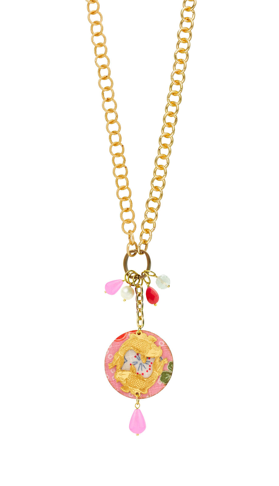 Collana in alluminio galvanizzato oro, elementi, seta e pietre naturali. Lunghezza collana regolabile 53/106 cm. Lunghezza ciondolo 11 cm. Made in Italy