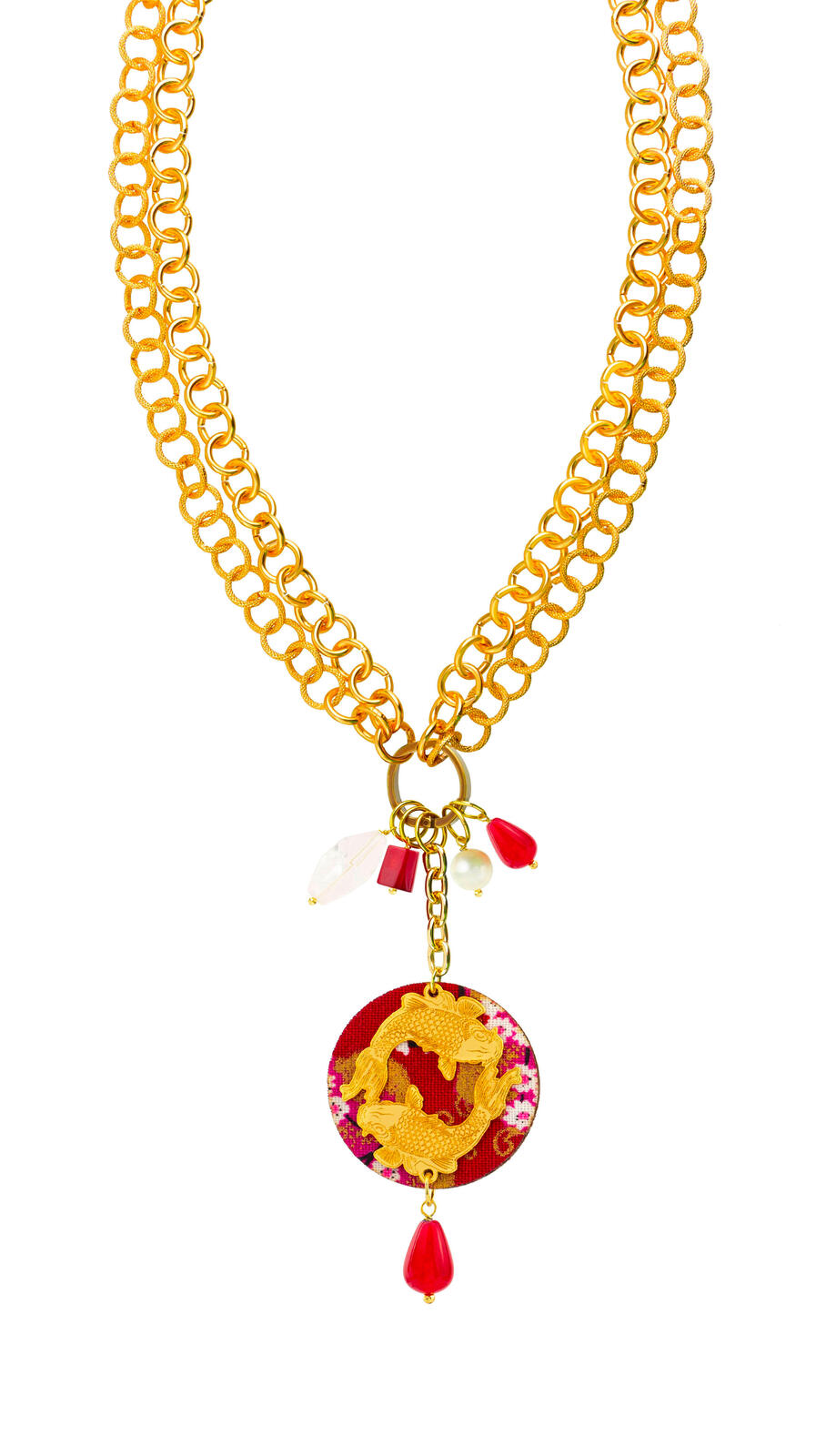 La collezione Koi e Fuj-San è composta da orecchini e collane con forme diverse ma collegate dal tema centrale della carpa Koi, simbolo di buon auspicio e longevità nell'Estremo Oriente. La carpa, protagonista dell'arte giapponese, rappresenta la tenacia nel superare gli ostacoli e il coraggio nel perseguire grandi traguardi.