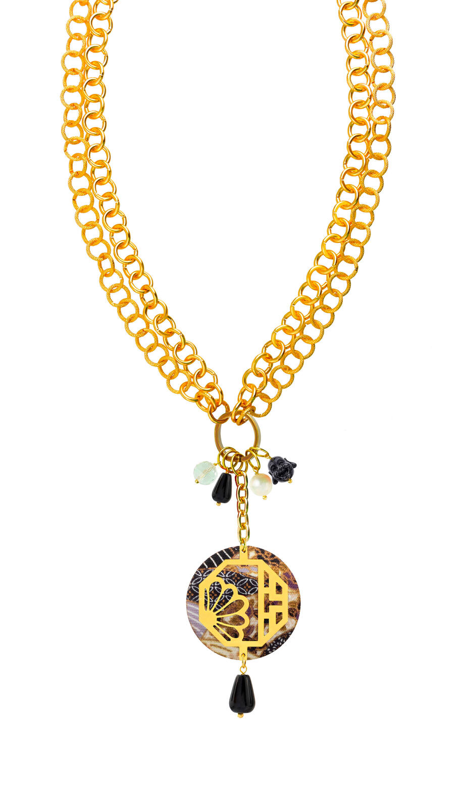 Collana in alluminio galvanizzato oro, elementi, seta e pietre naturali. Lunghezza collana regolabile 53/106 cm. Lunghezza ciondolo 11,5 cm. Made in Italy