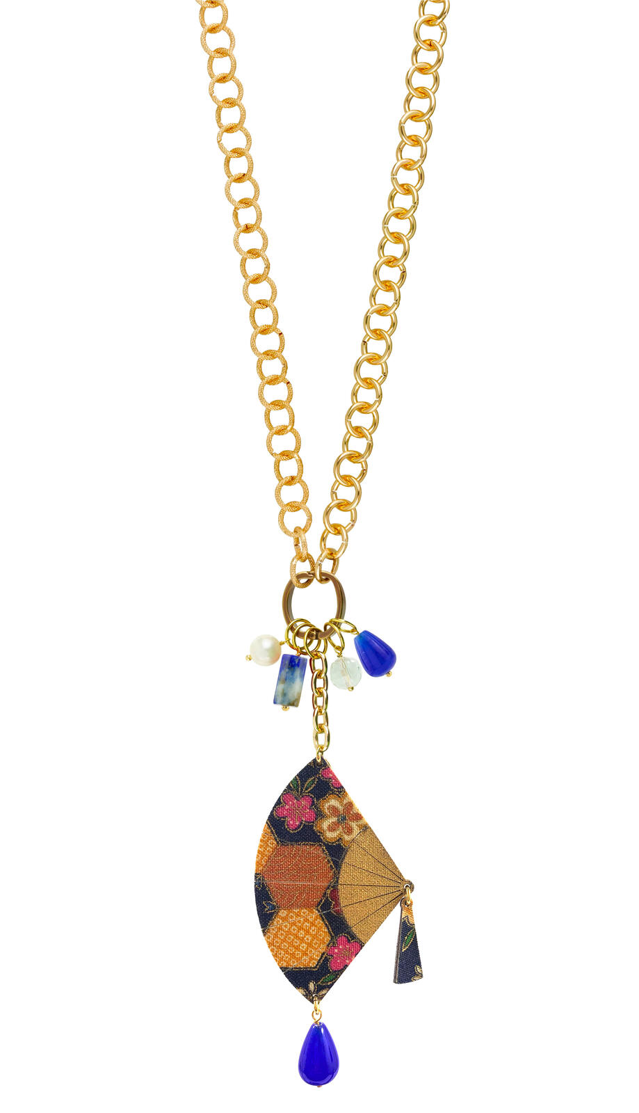Collana in alluminio galvanizzato oro, elementi, seta e pietre naturali. Lunghezza collana regolabile 53/106 cm. Lunghezza ciondolo 11 cm. Made in Italy
