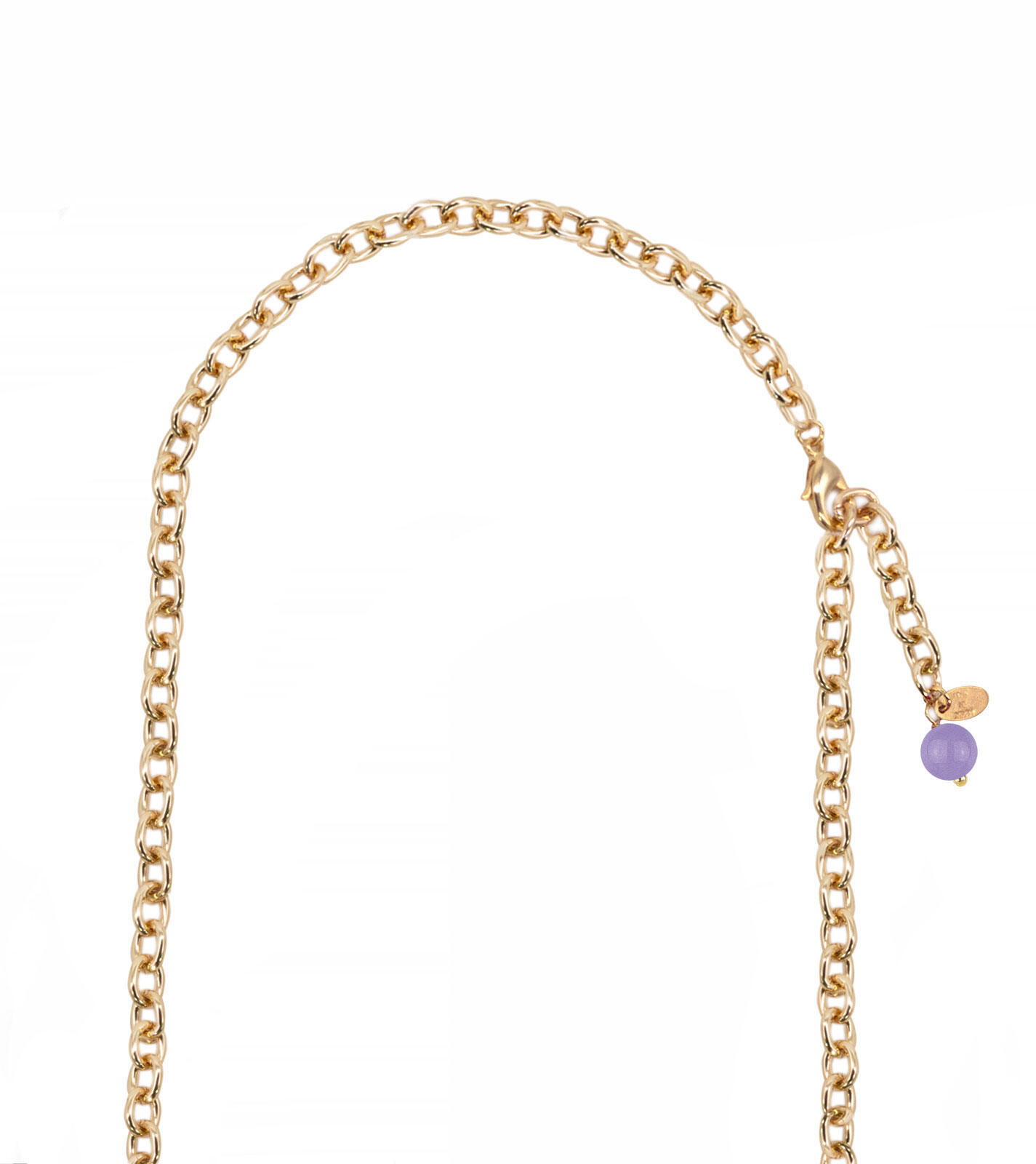 Collana in alluminio galvanizzato oro, seta giapponese e pietre naturali. Lunghezza totale collana 57,5 cm. Lunghezza catena 44,5 cm. Chiusura con moschettone. Made in Italy