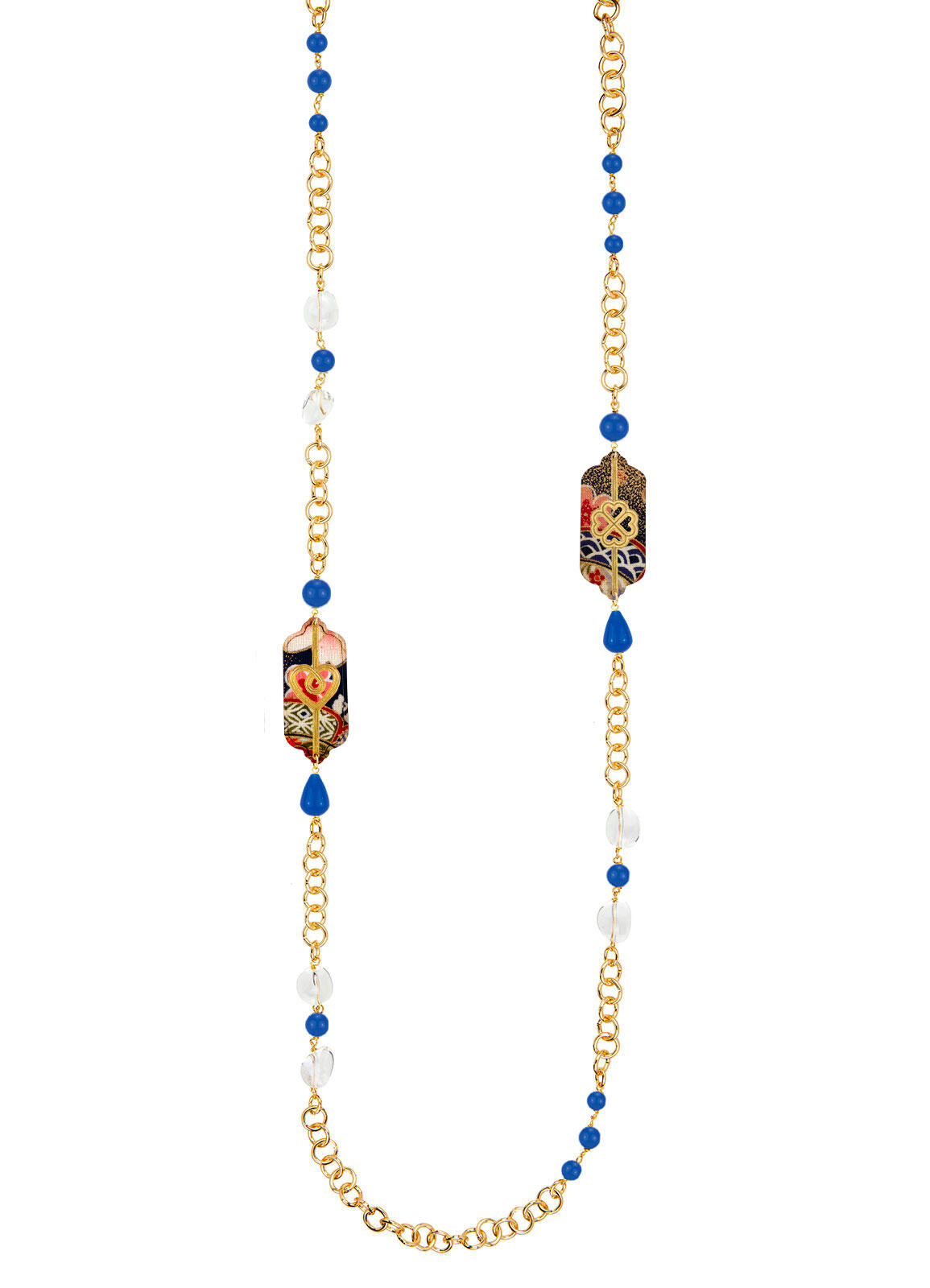Collana in alluminio galvanizzato oro, sete giapponesi e pietre naturali. Lunghezza 110 cm. Made in Italy