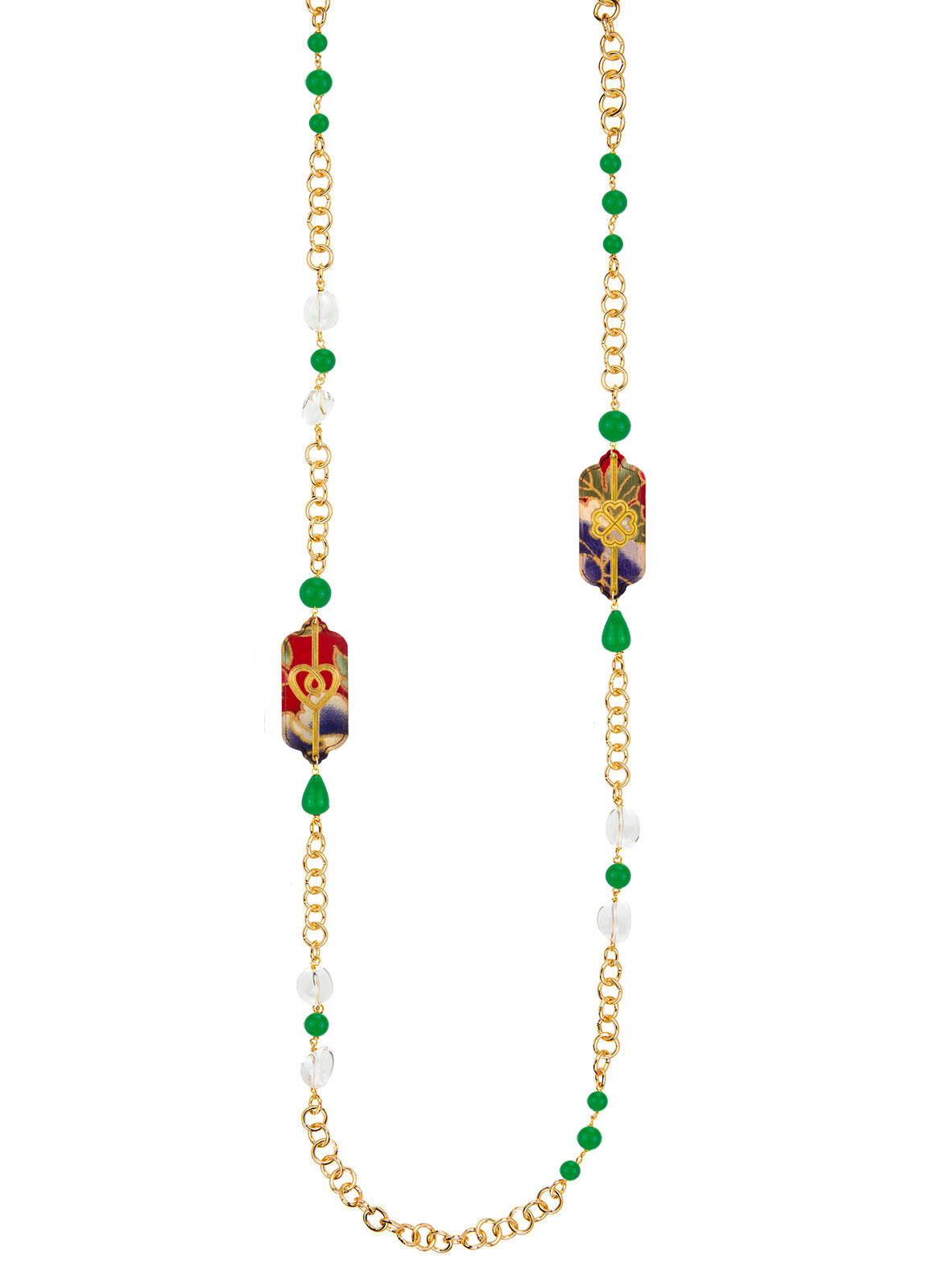 Collana in alluminio galvanizzato oro, sete giapponesi e pietre naturali. Lunghezza 110 cm. Made in Italy