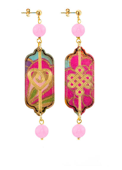 Orecchini in seta, ottone galvanizzato oro e pietre naturali. Lunghezza 6 cm. Made in Italy