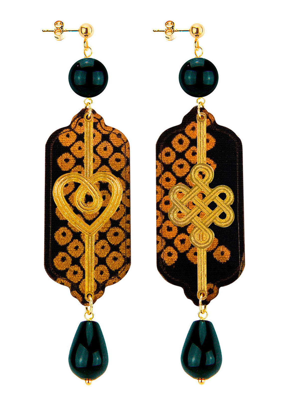 Orecchini in seta, ottone galvanizzato oro e pietre naturali. Lunghezza 9 cm. Made in Italy