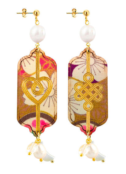 I quattro musubi danno vita a due coppie di orecchini: Hanamusubi con Katabami, Musubikiri con il nodo dell’Infinito. I materiali restano fedeli alla tradizione Lebole: seta da antichi kimono giapponesi, tessuti a righe o pois, ottone galvanizzato oro e pietre naturali.