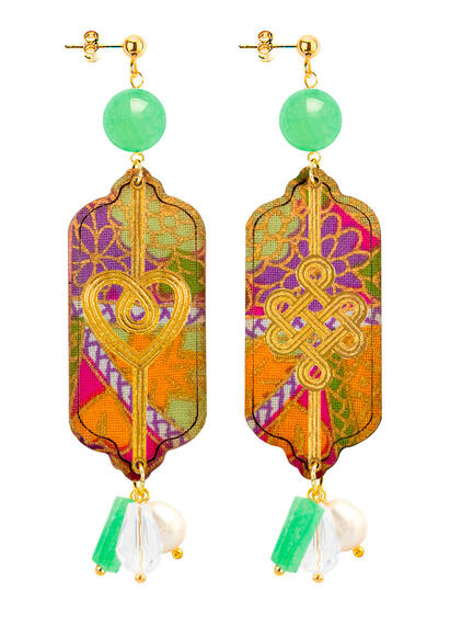 I quattro musubi danno vita a due coppie di orecchini: Hanamusubi con Katabami, Musubikiri con il nodo dell’Infinito. I materiali restano fedeli alla tradizione Lebole: seta da antichi kimono giapponesi, tessuti a righe o pois, ottone galvanizzato oro e pietre naturali.