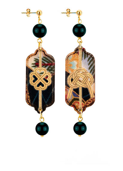 Orecchini in seta, ottone galvanizzato oro e pietre naturali. Lunghezza 6 cm. Made in Italy