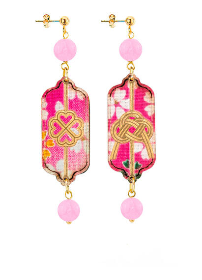 I quattro musubi danno vita a due coppie di orecchini: Hanamusubi con Katabami, Musubikiri con il nodo dell’Infinito. I materiali restano fedeli alla tradizione Lebole: seta da antichi kimono giapponesi, tessuti a righe o pois, ottone galvanizzato oro e pietre naturali.